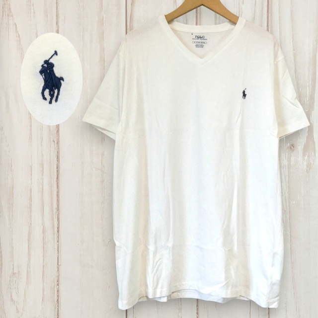 【ポロラルフローレン 半袖ロゴ刺繍Tシャツ】 Vネック ビッグサイズ XL 白 POLO RALPH LAUREN 古着 メンズ [250627-010]