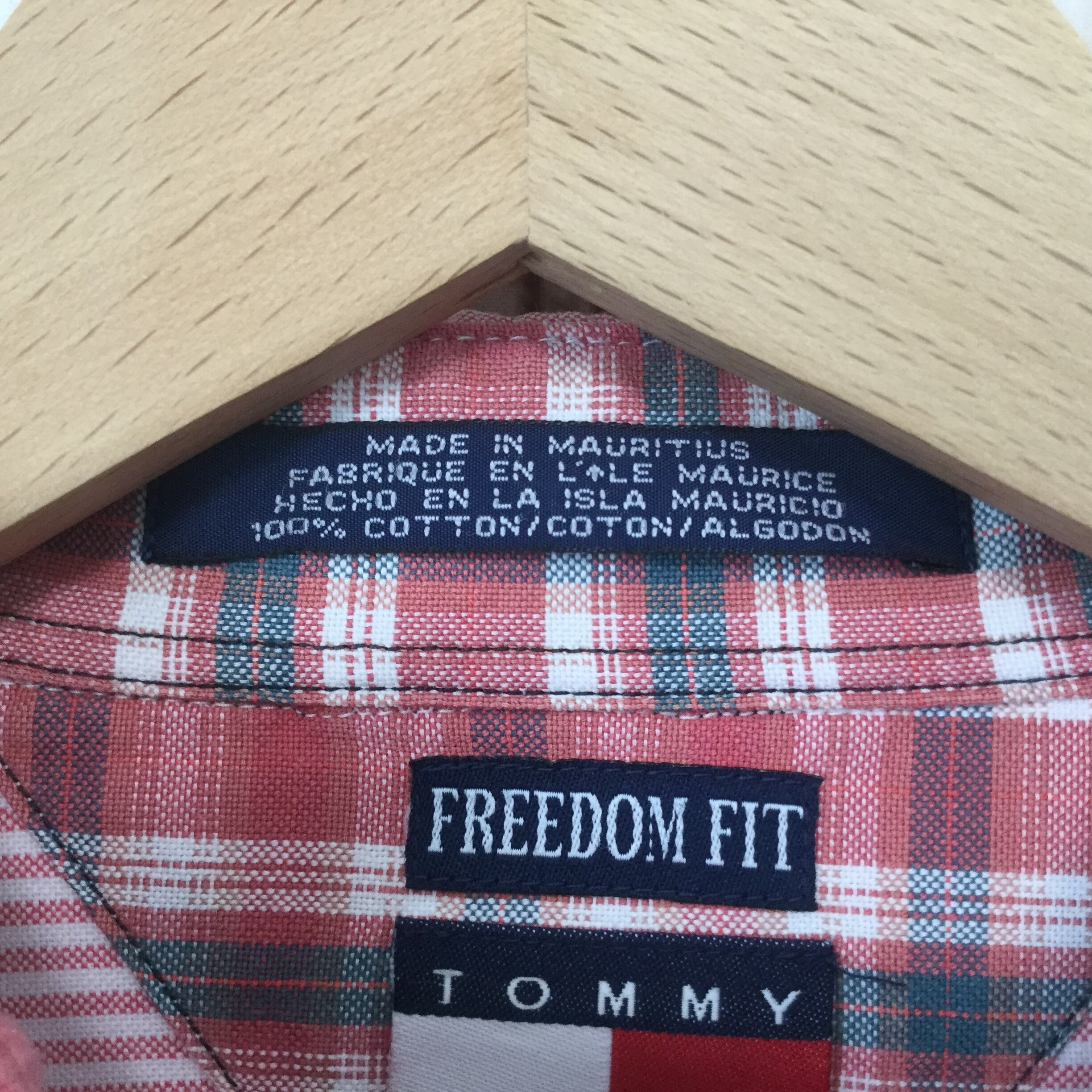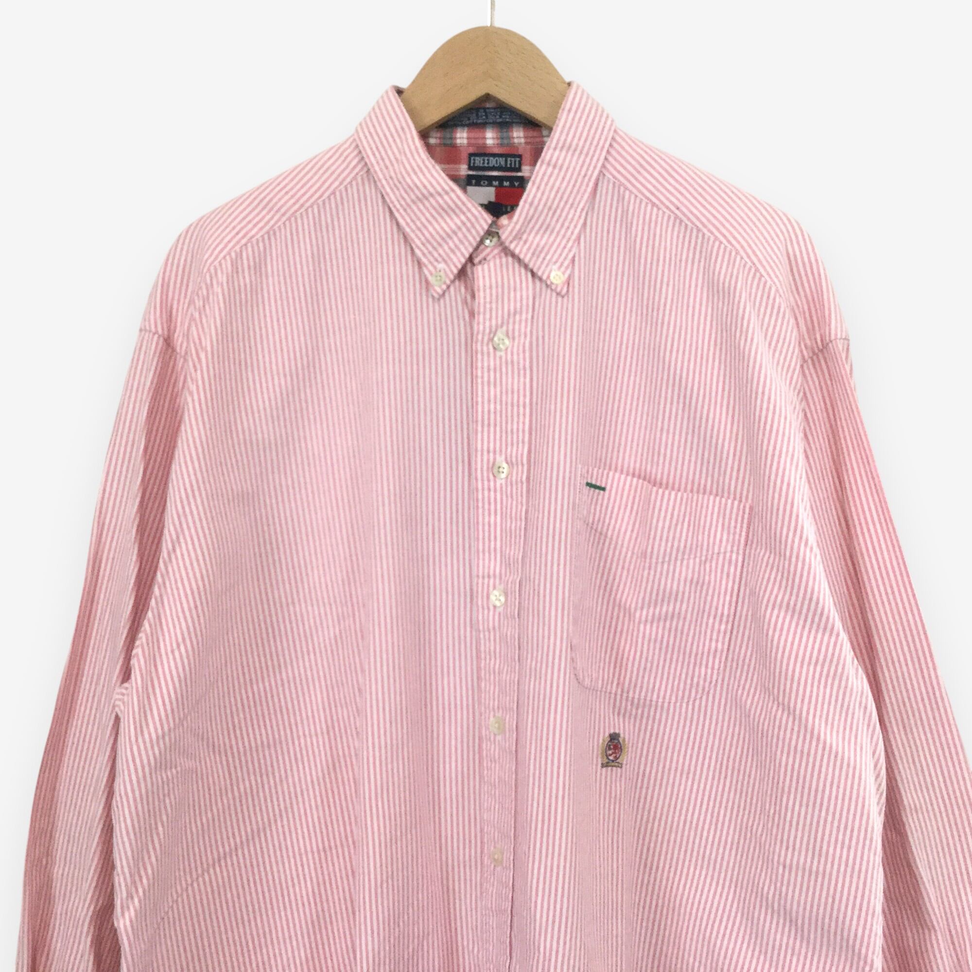 USA古着 トミーヒルフィガー 長袖ボタンダウンシャツ】ワンポイント エンブレム 刺繍 フラッグタグ ストライプ L相当 TOMMY HILFIGER 古着 [250216-011]