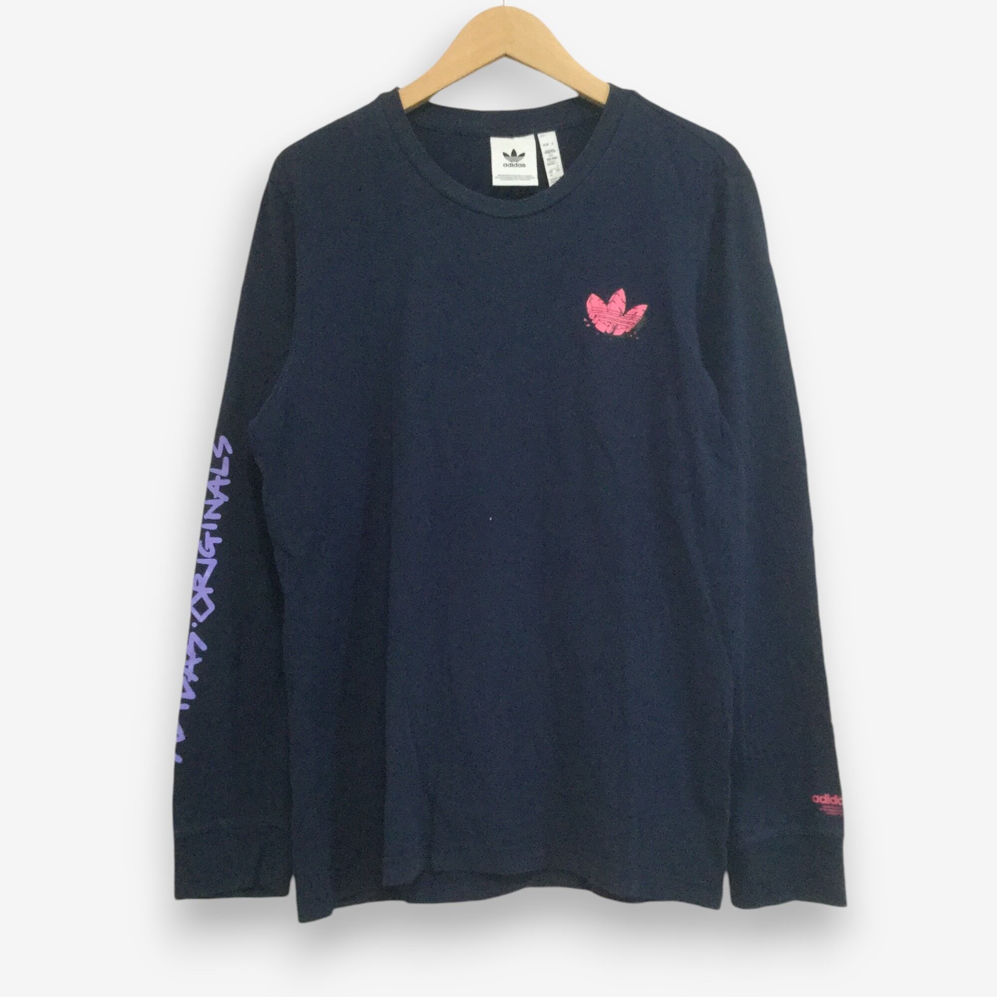 【アディダス 長袖Tシャツ】 変わりロゴプリント 袖ロゴ XL ネイビー adidas 古着 [250414-003]