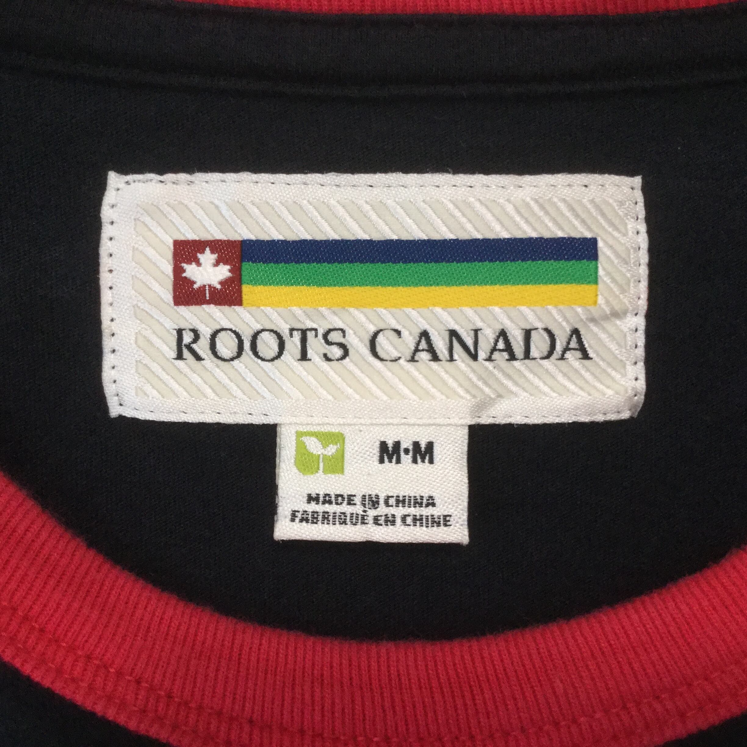 【派手 星条旗ワッペン リンガーTシャツ】USA輸入 M 黒 ROOTS CANADA 古着 メンズ [250414-038]