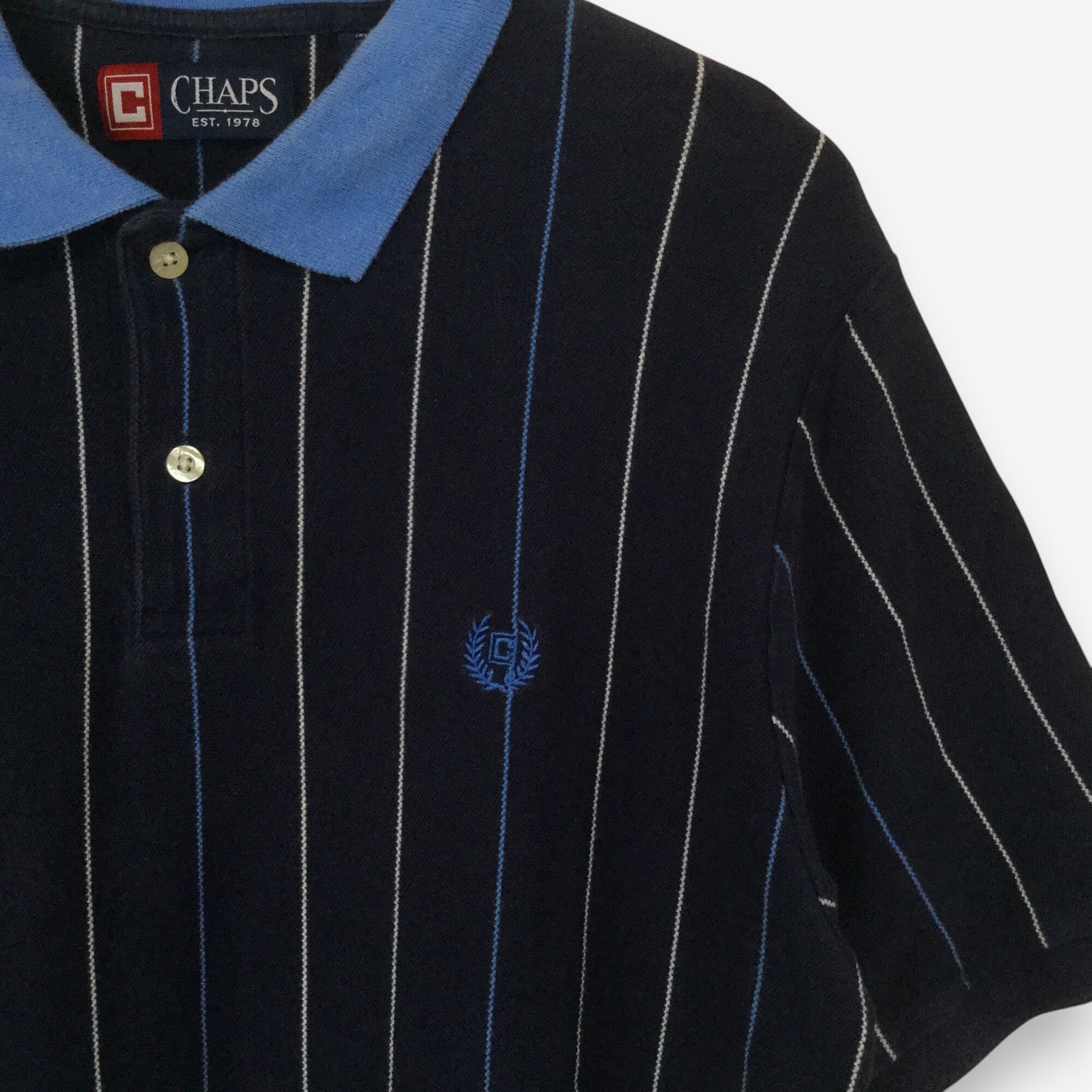 【チャップス 半袖ロゴ刺繍ポロシャツ】 ストライプ L ネイビー Chaps 古着 [250414-028]