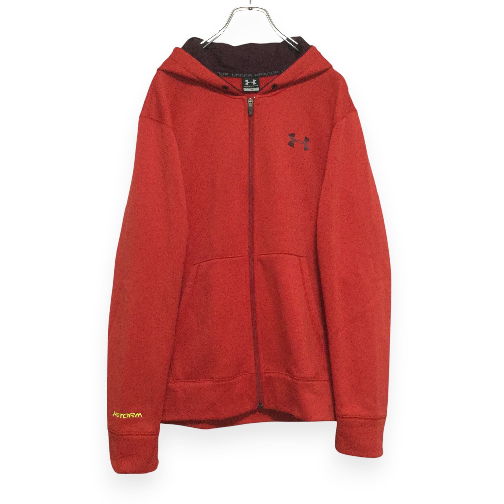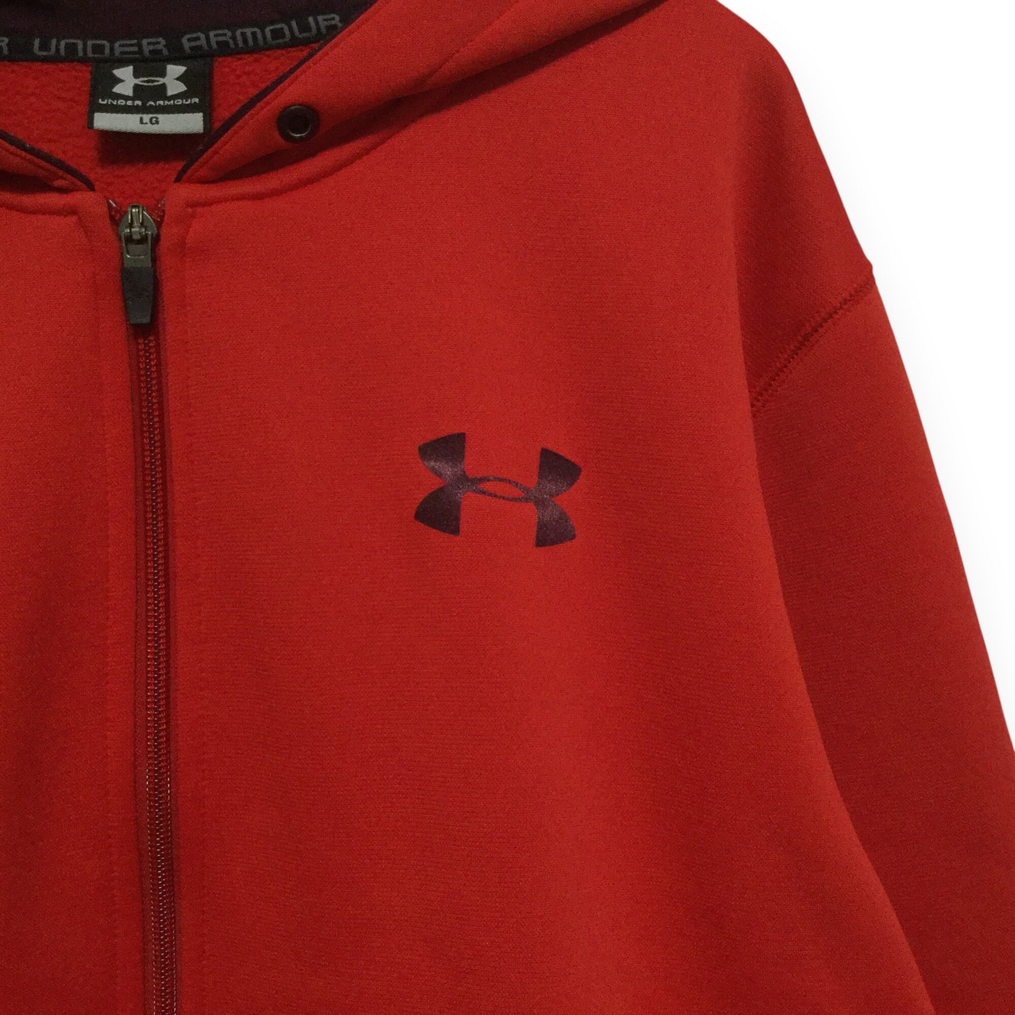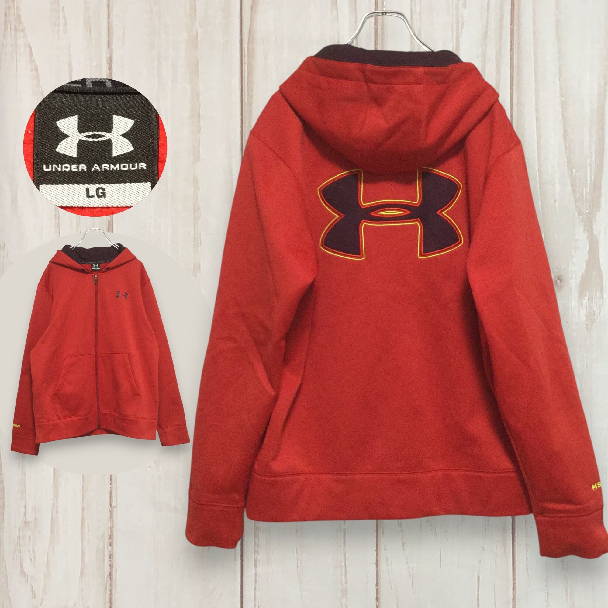【アンダーアーマー ジャージ】 背面ビッグロゴ ロゴプリント フード ジップチャーム トラックジャケット L相当 赤 UNDER ARMOUR 古着 メンズ [241110-017]