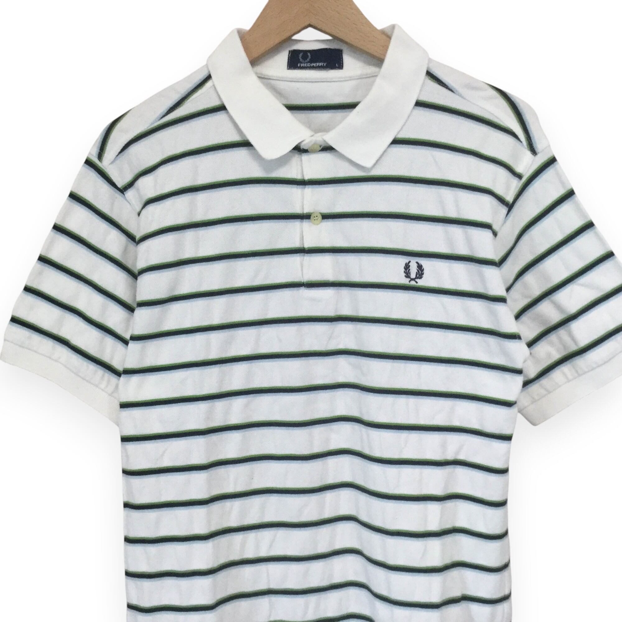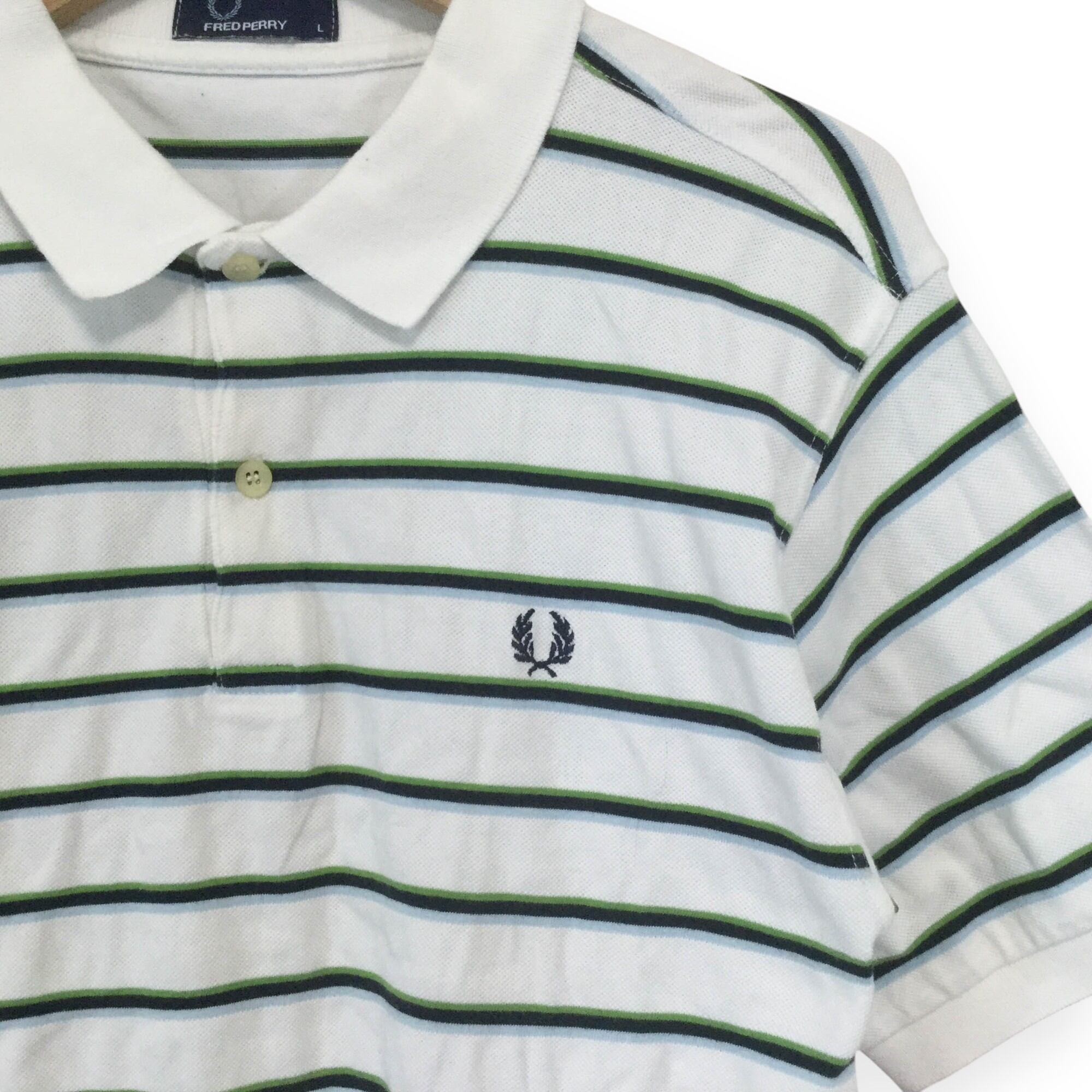 【フレッドペリー 半袖ロゴ刺繍ポロシャツ】 ボーダー L 白 Fred Perry 古着 メンズ [250530-036]