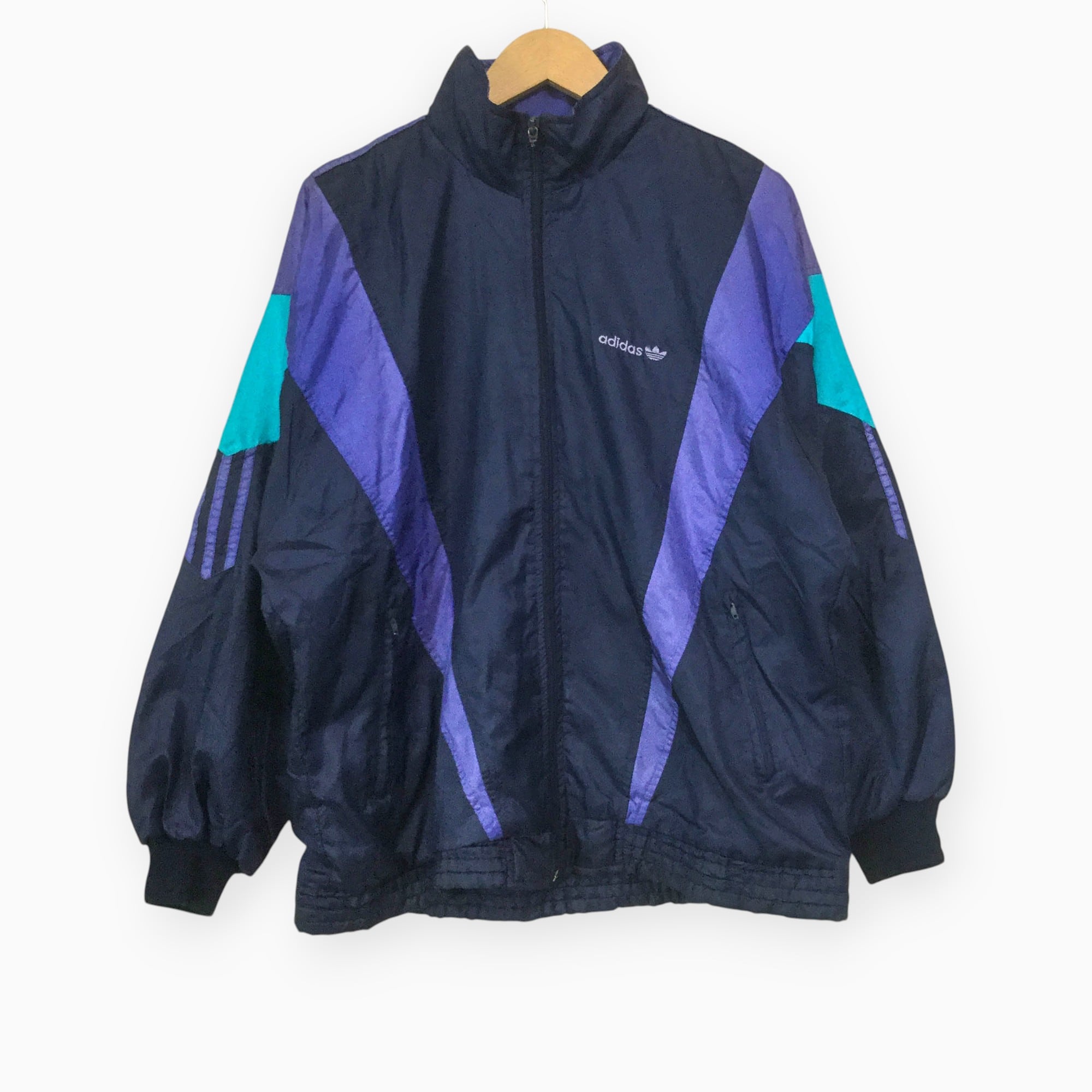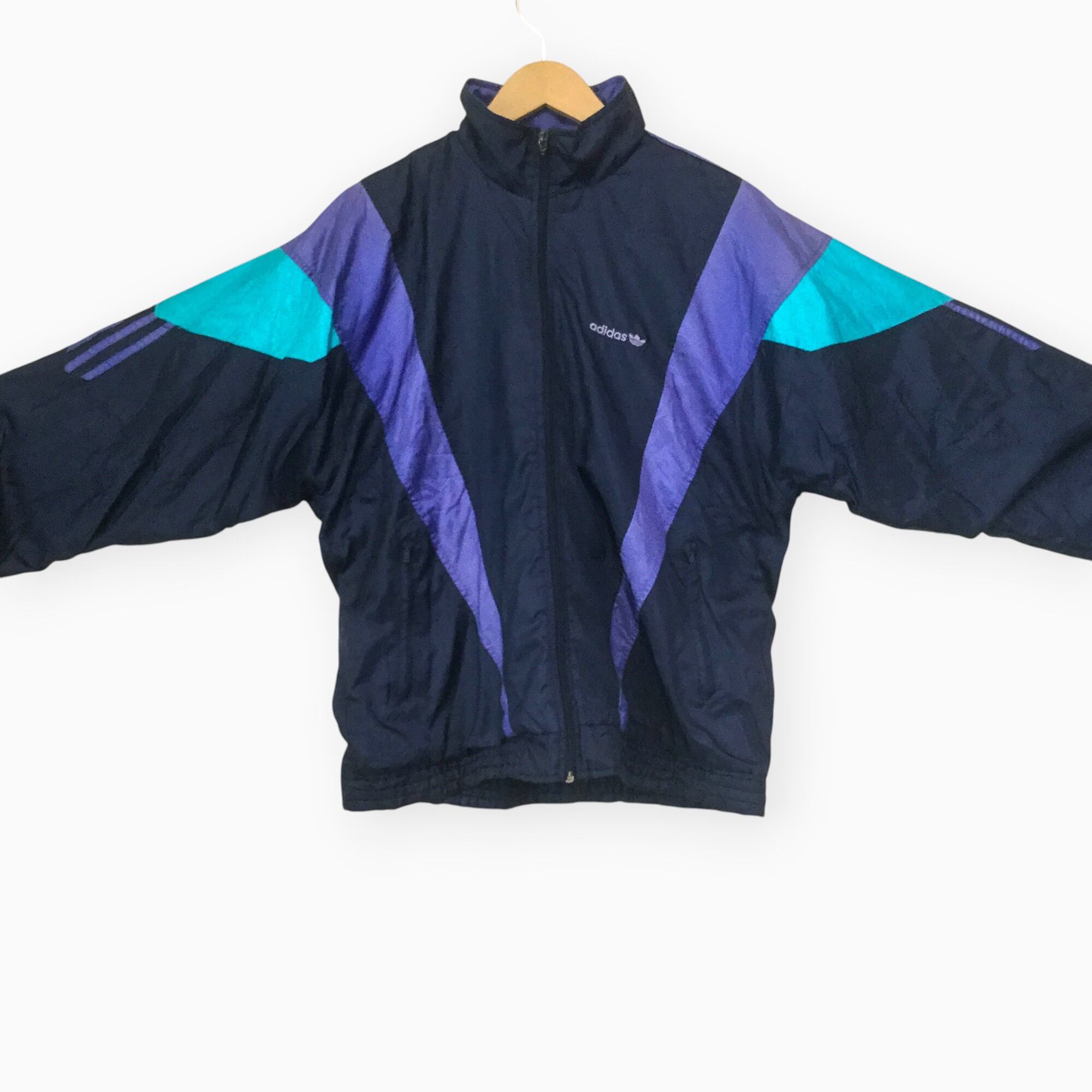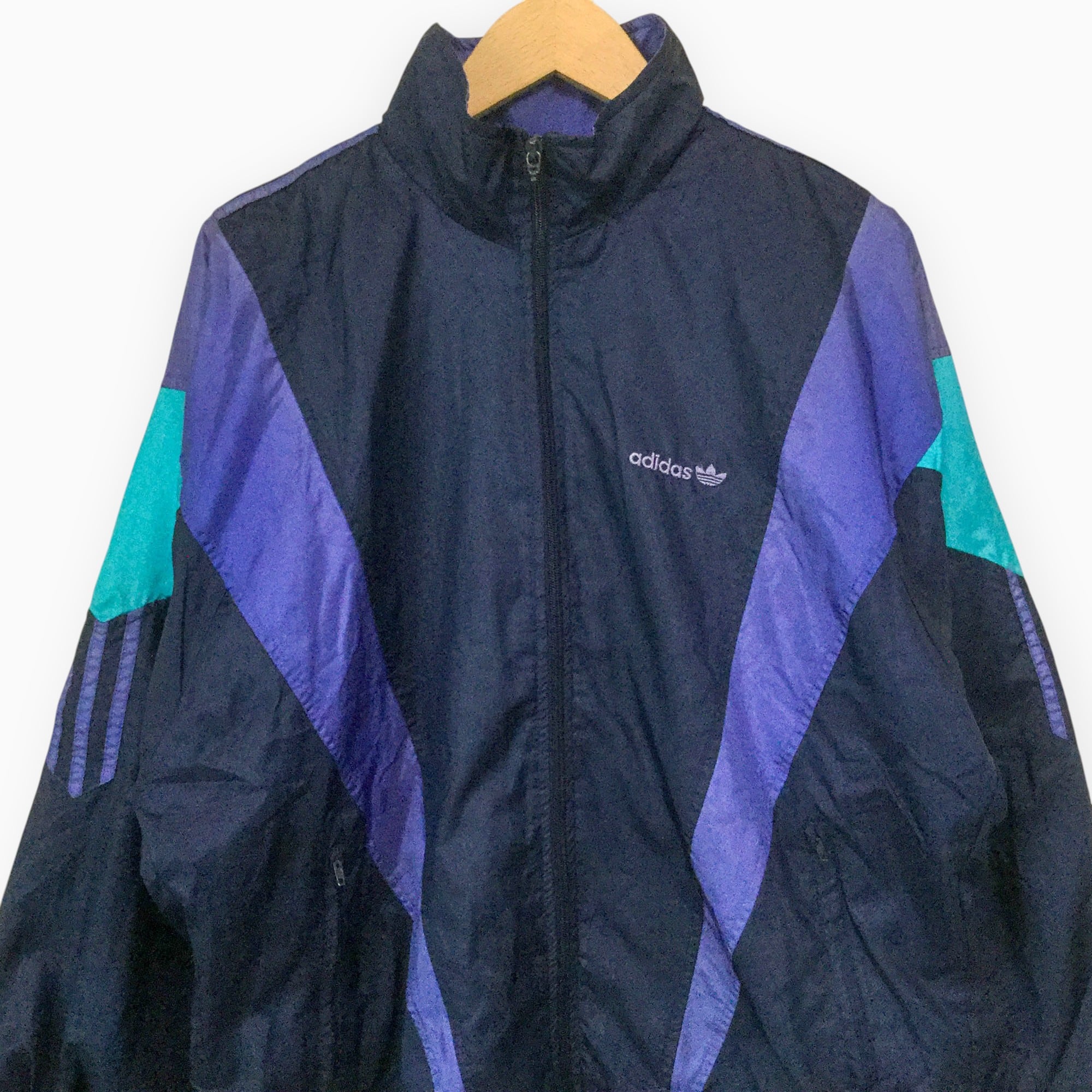 アディダス adidas 黒 ブルー グリーン 80年代 トレフォイル 80s ナイロンジャケット ビンテージ 切替 刺繍ロゴ ヴィンテージ Rなし スポーツジャケット
