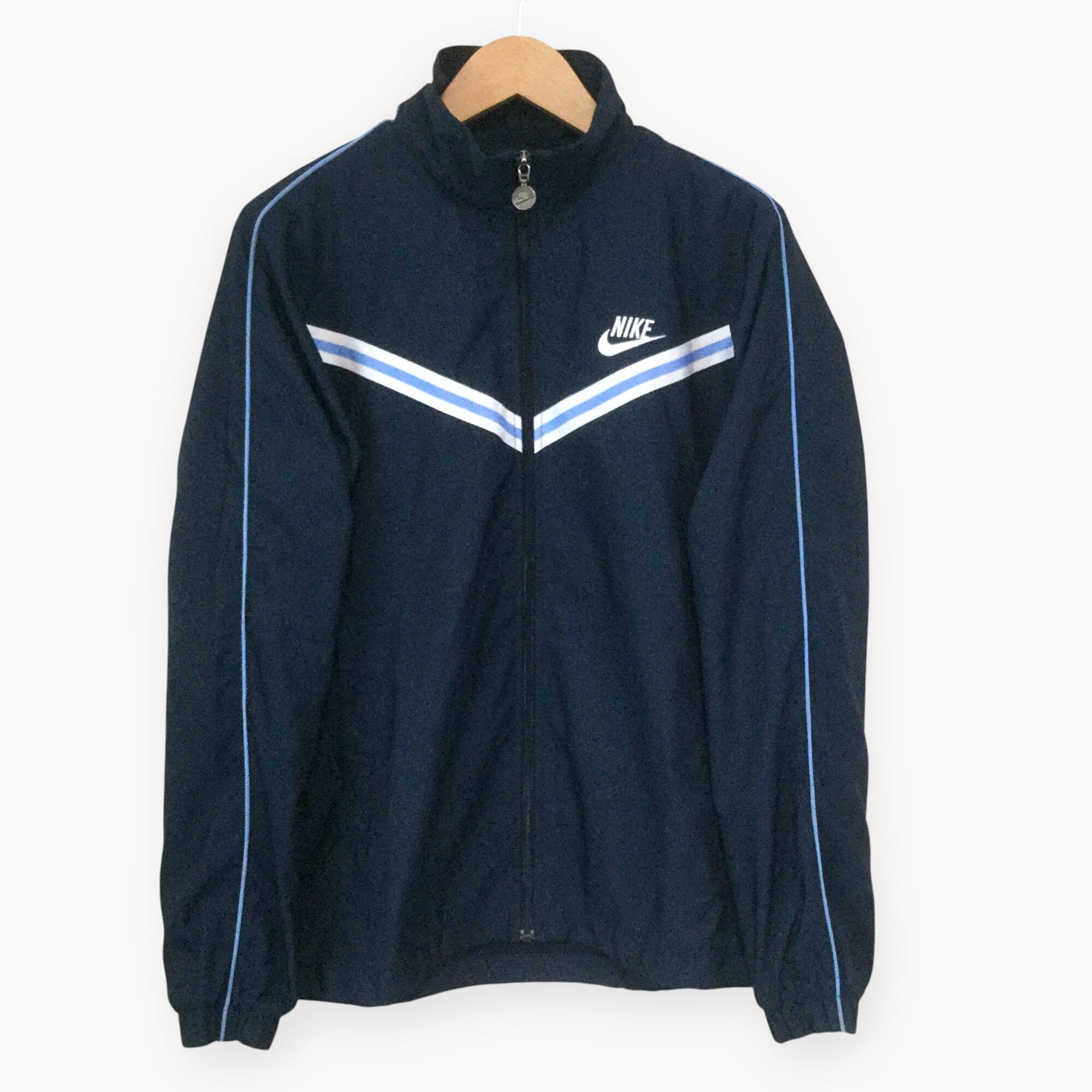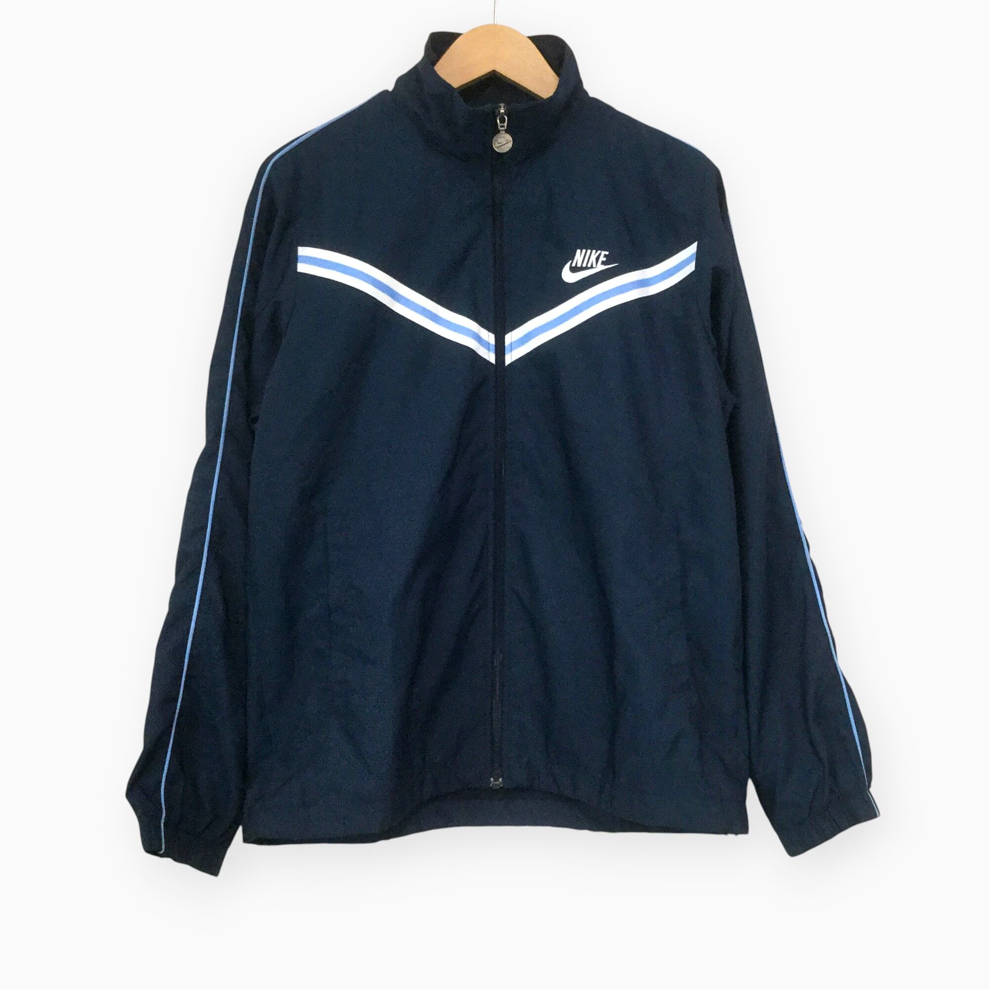 NIKE ナイキ ポリジャケット トラックジャケット 00s ワンポイント ロゴ刺繍 ZIPロゴチャーム ネイビー スポーツジャケット フルジップ スウッシュ 古着 メンズ M