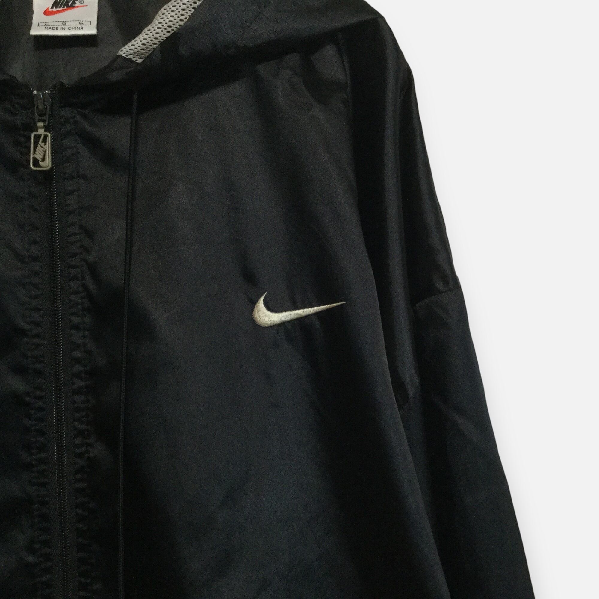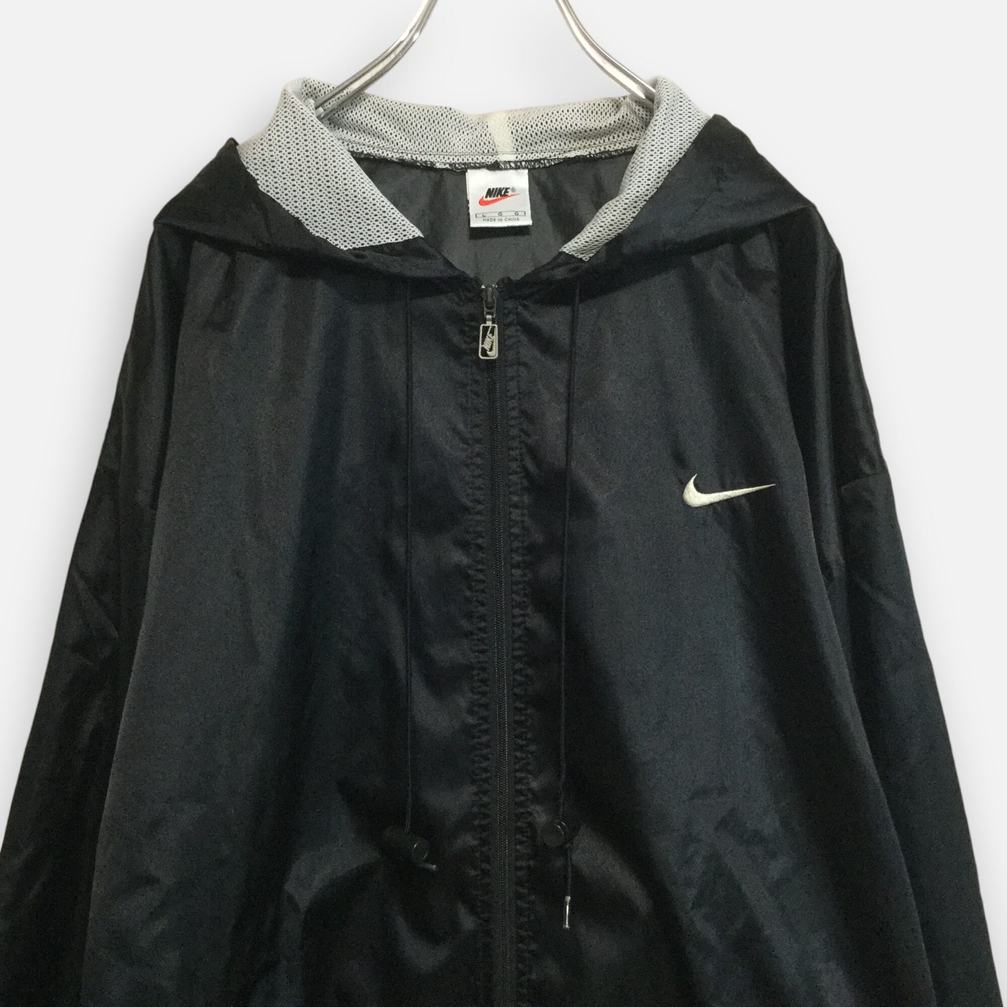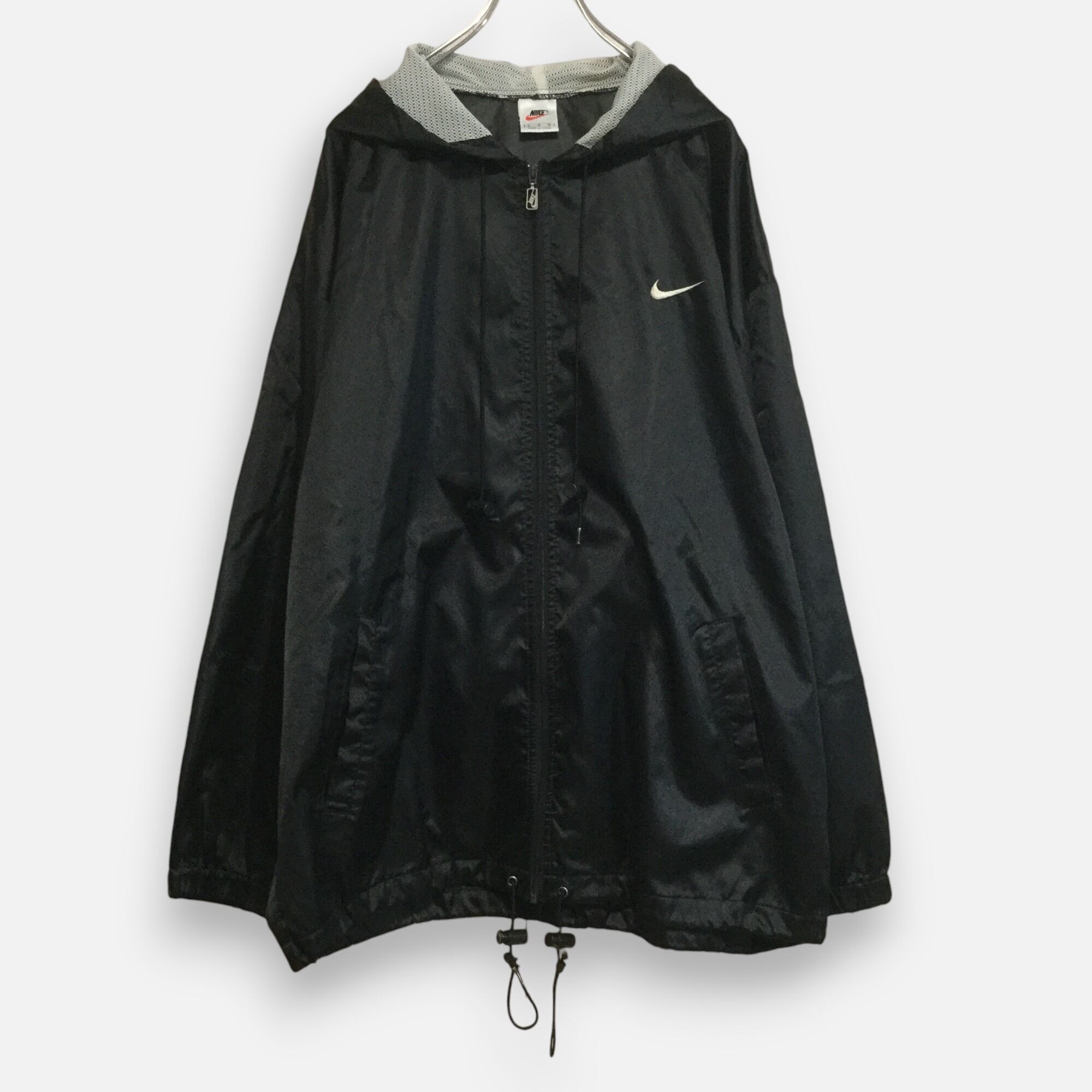 古着 ナイキ NIKE ナイロンジャケット 90s 銀タグ 刺繍スウッシュ フード ロゴチャーム ブラック L
