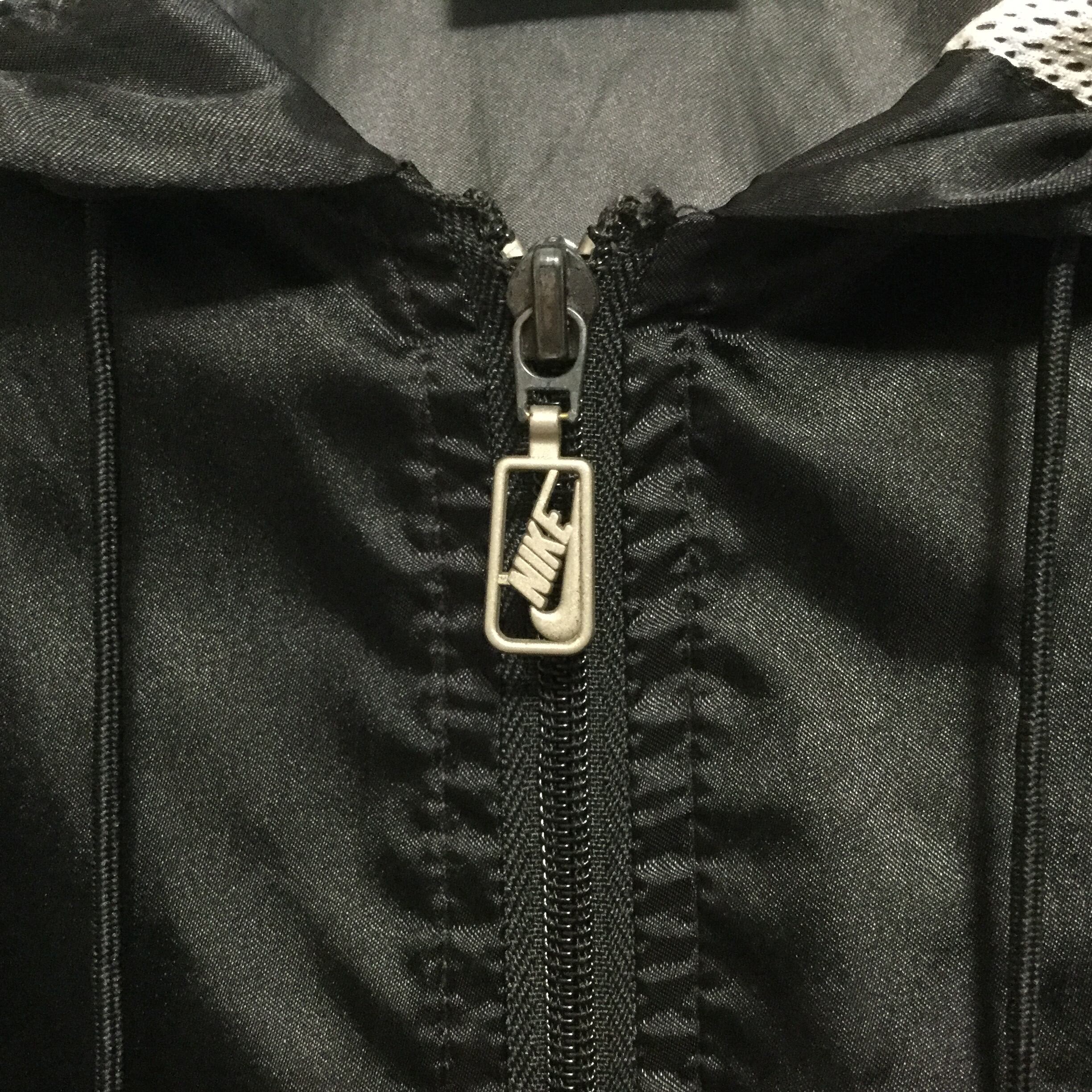 ナイキ NIKE ナイロンジャケット 90s 銀タグ 刺繍スウッシュ ワンポイント フードジャケット フルジップ ロゴチャーム ブラック スポーツジャケット ビッグシルエット ヴィンテージ 古着
