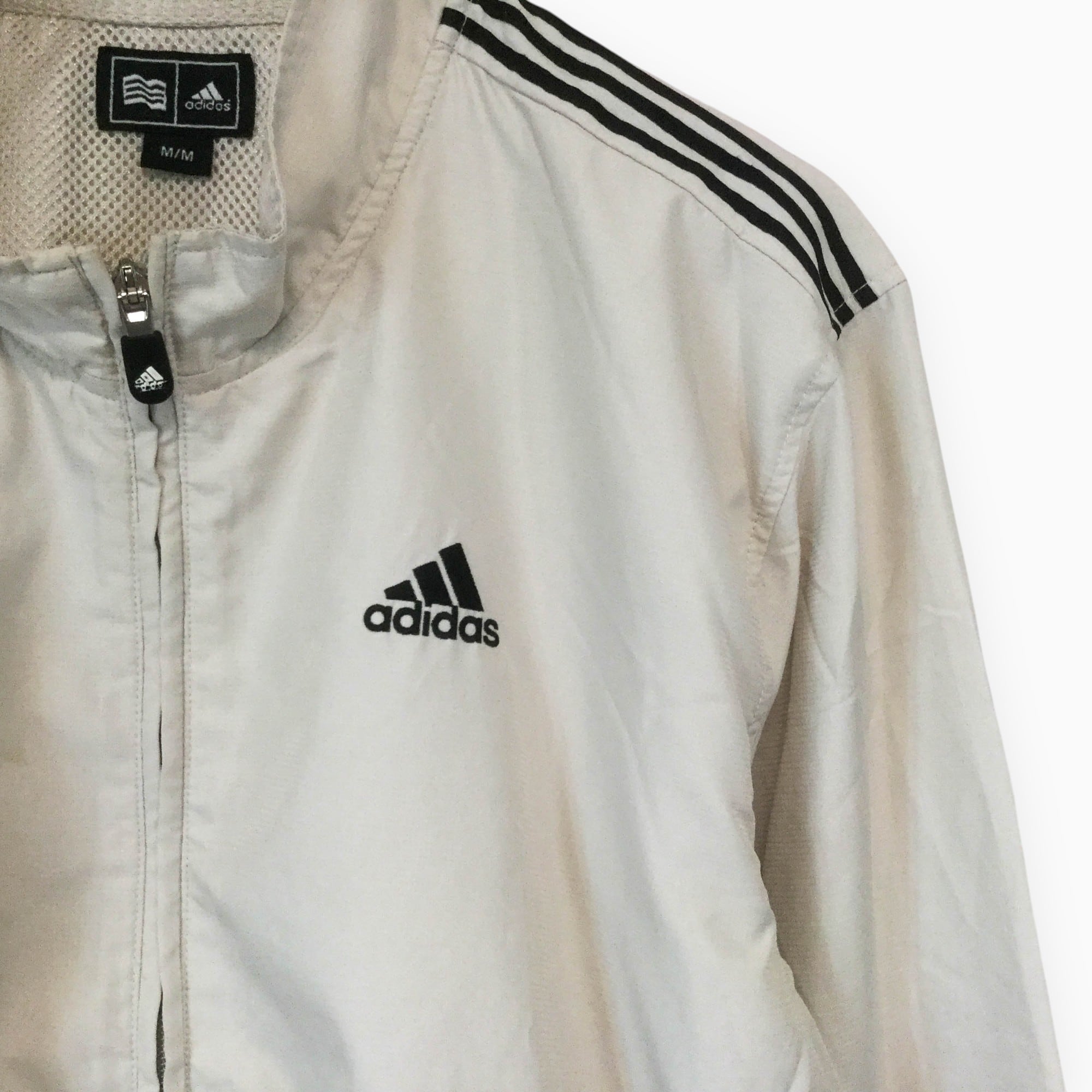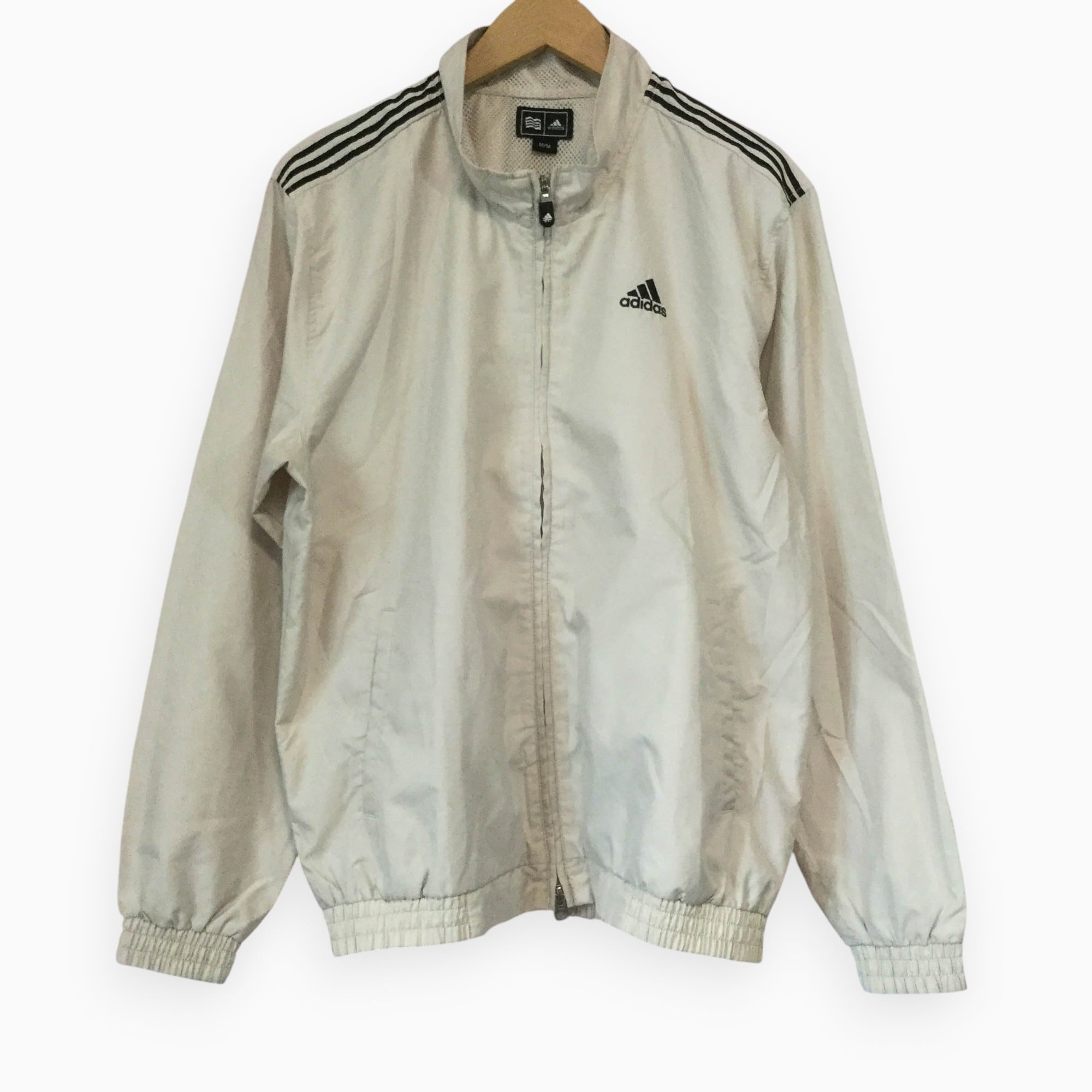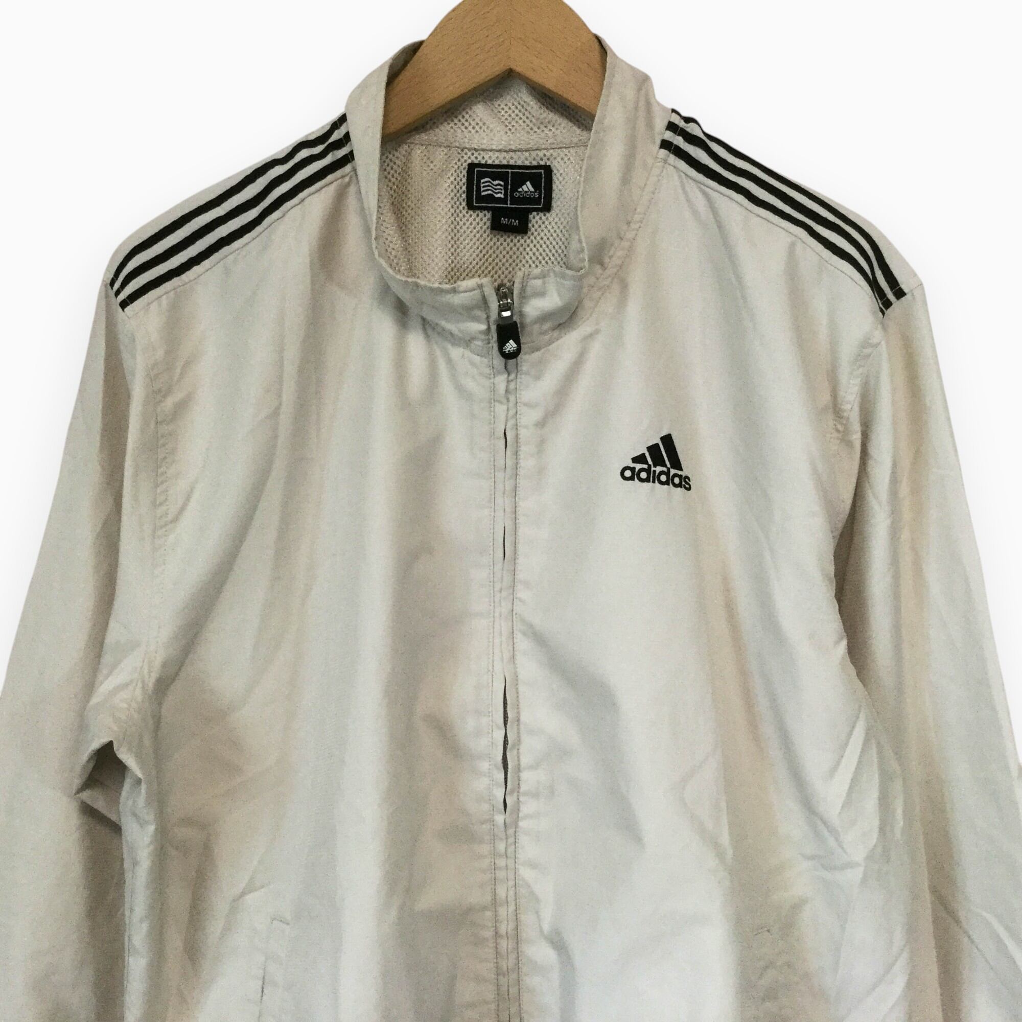 【アディダス ポリジャケット】 ロゴ刺繍 スリーライン 00s M ベージュ adidas 古着 メンズ [250627-017]
