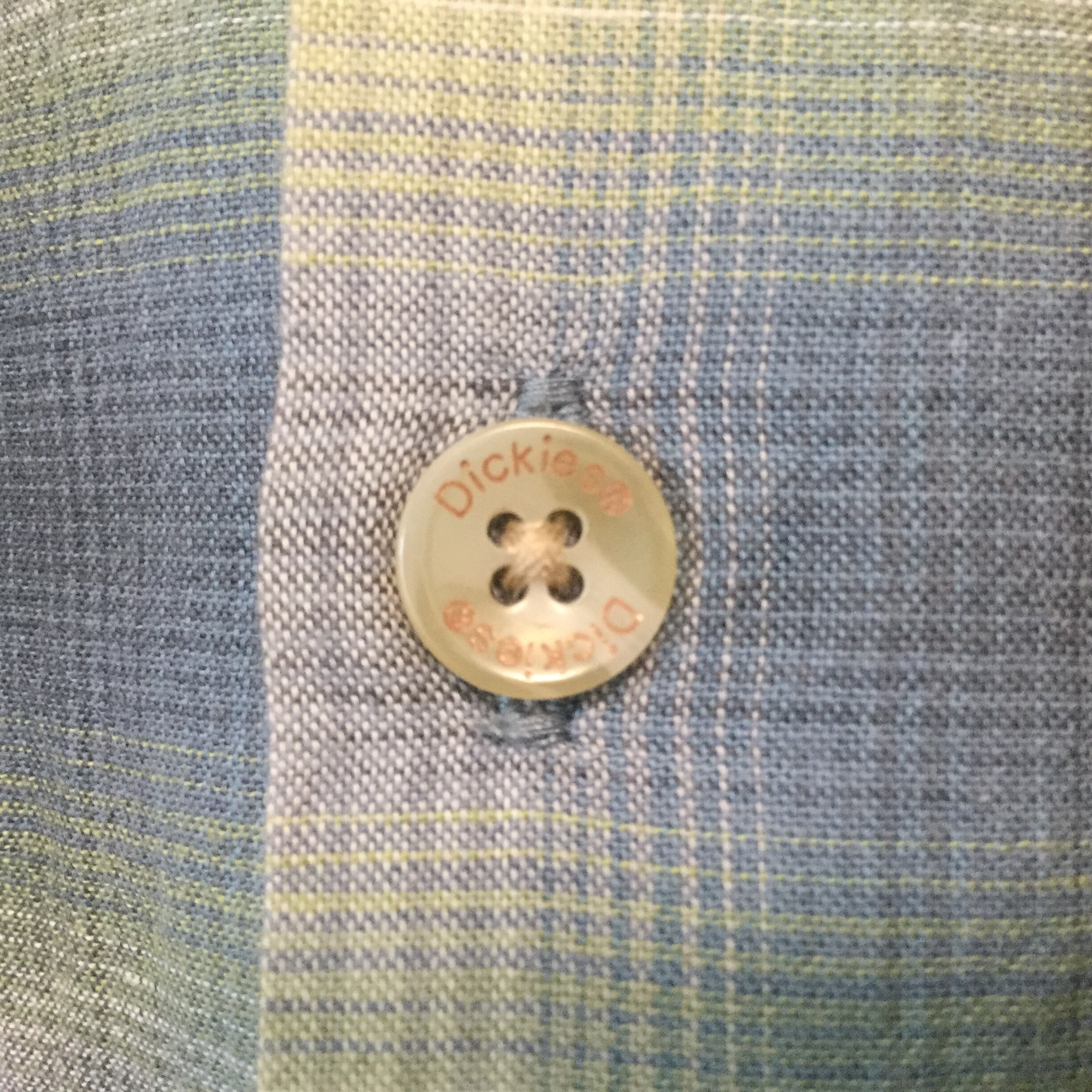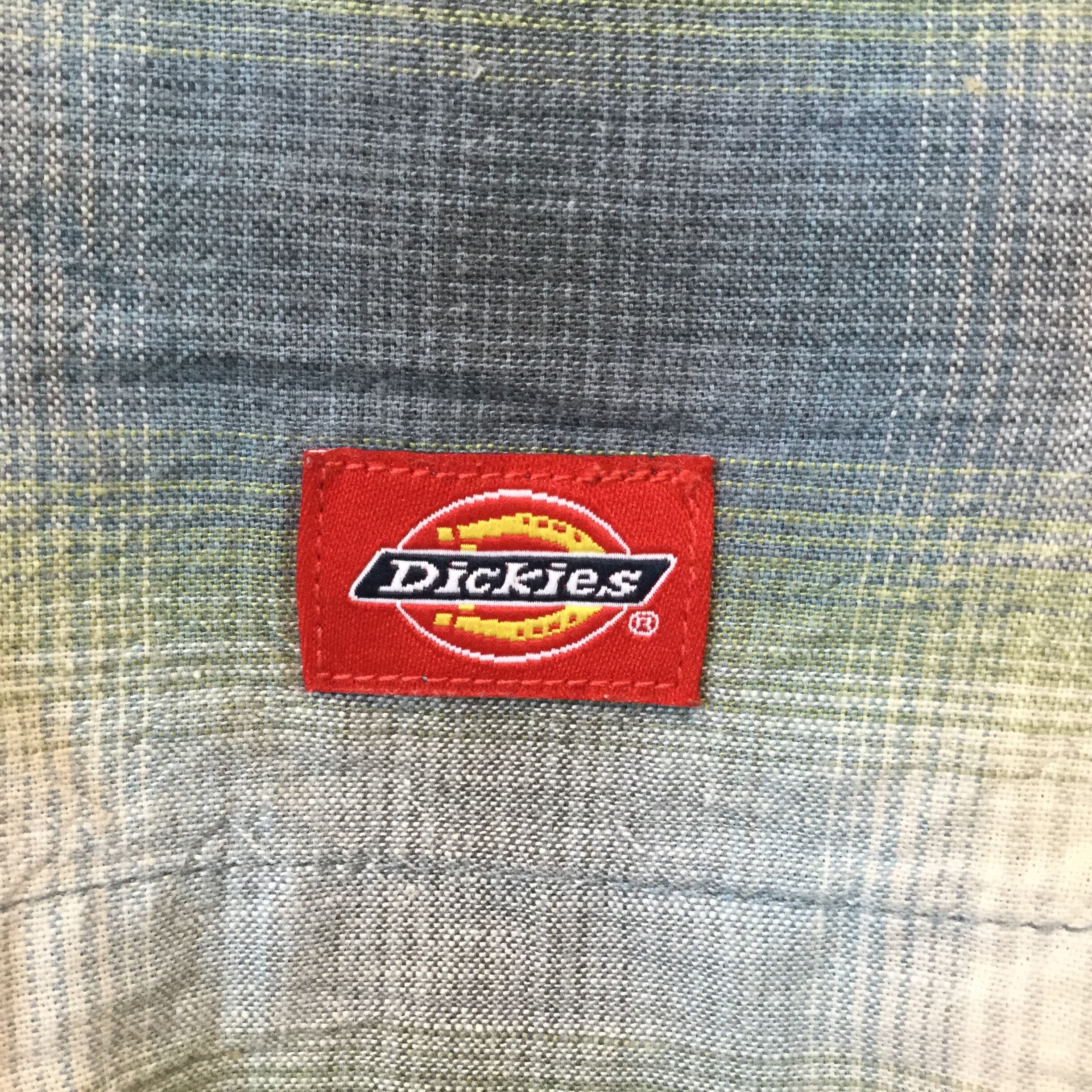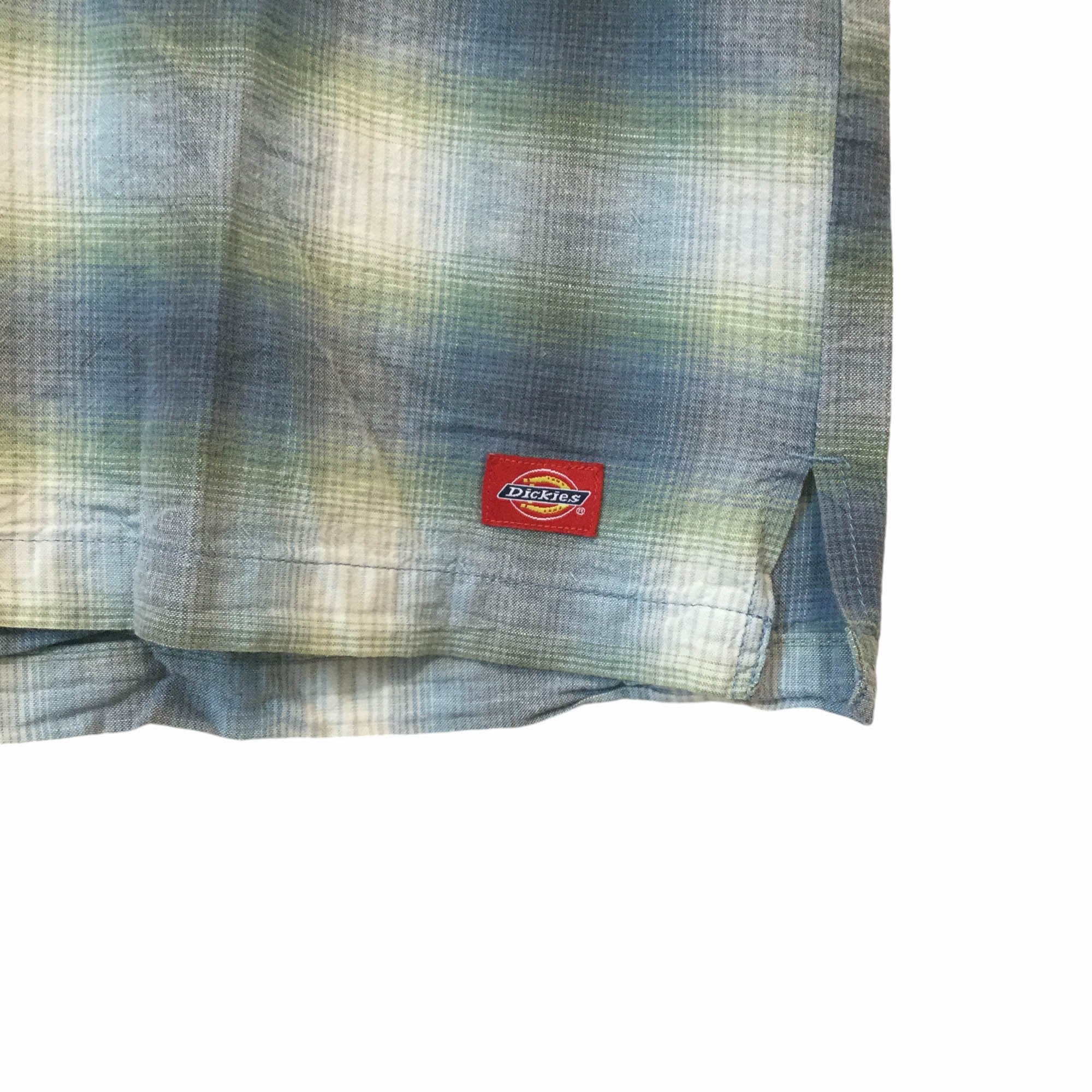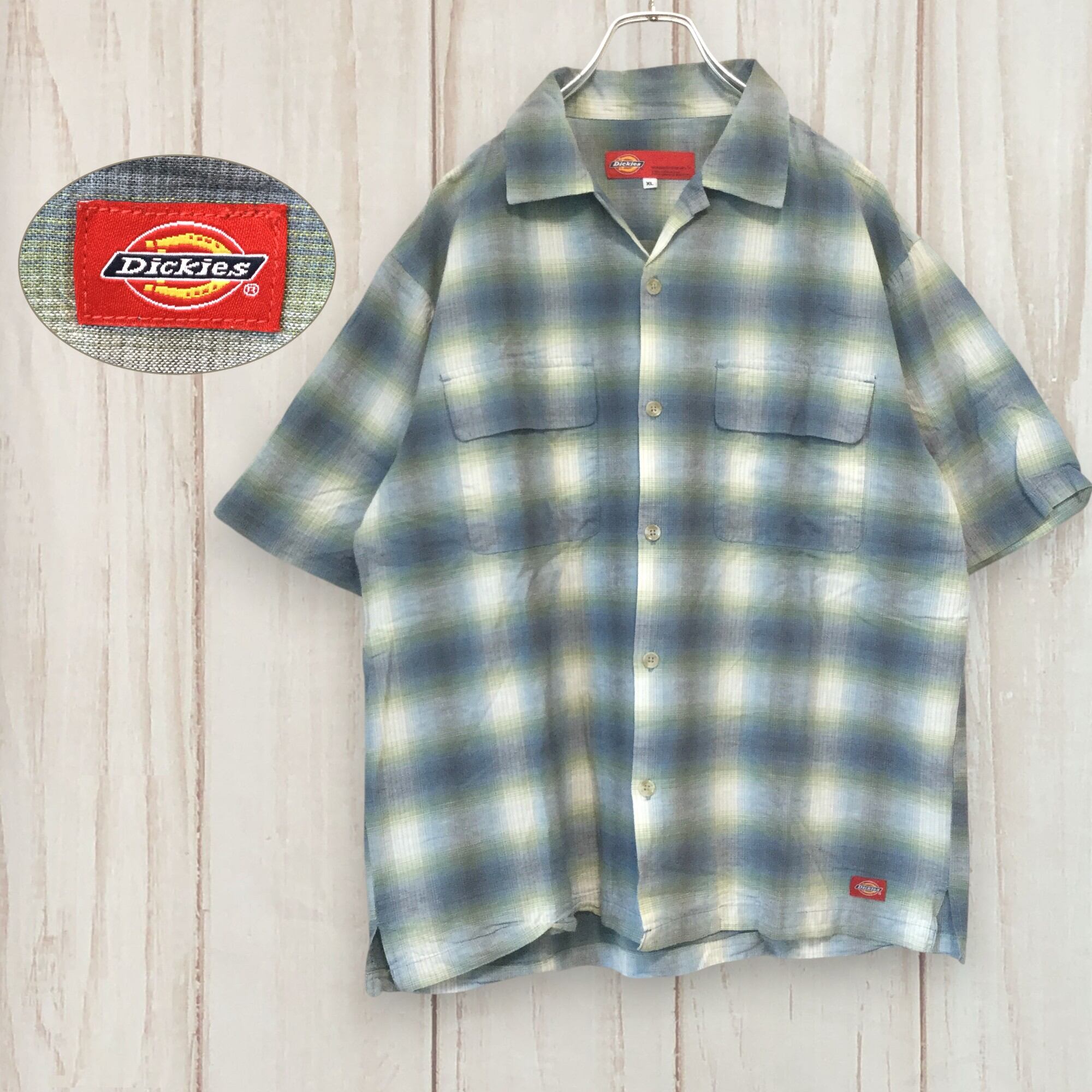 Dickies ディッキーズ オープンカラーシャツ 半袖 チェック オンブレ調 グリーン 緑 XLサイズ リネン混 コットンリネン ボックスシルエット ワーク カジュアル 古着 メンズ 夏物 オンブレ ロゴ