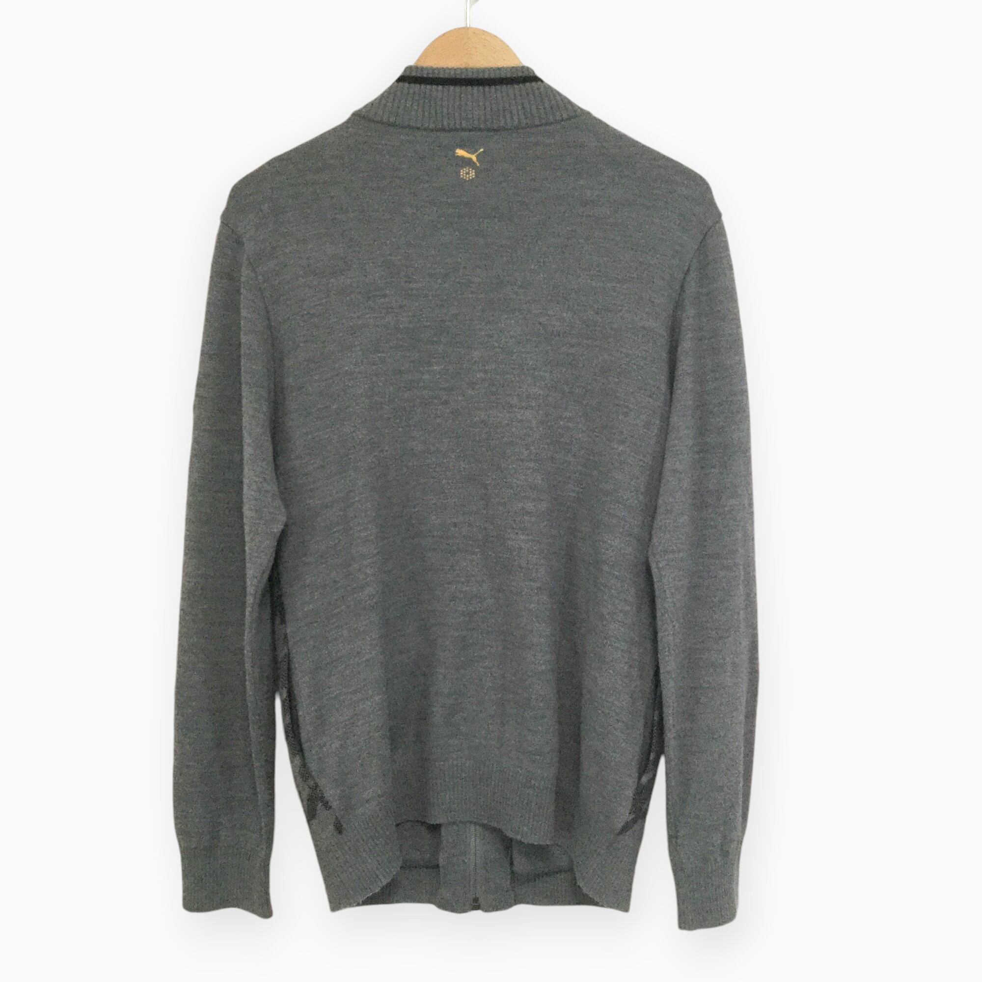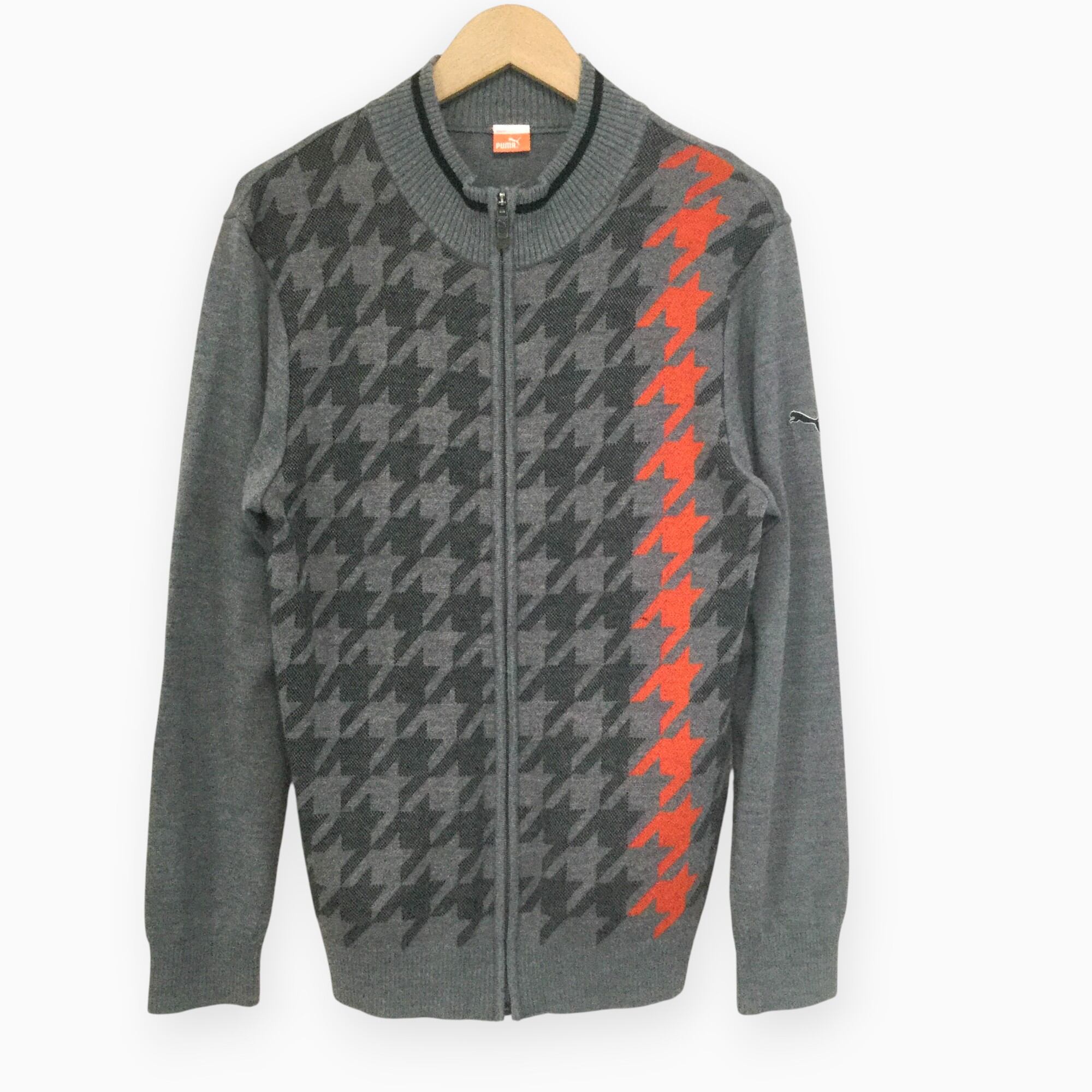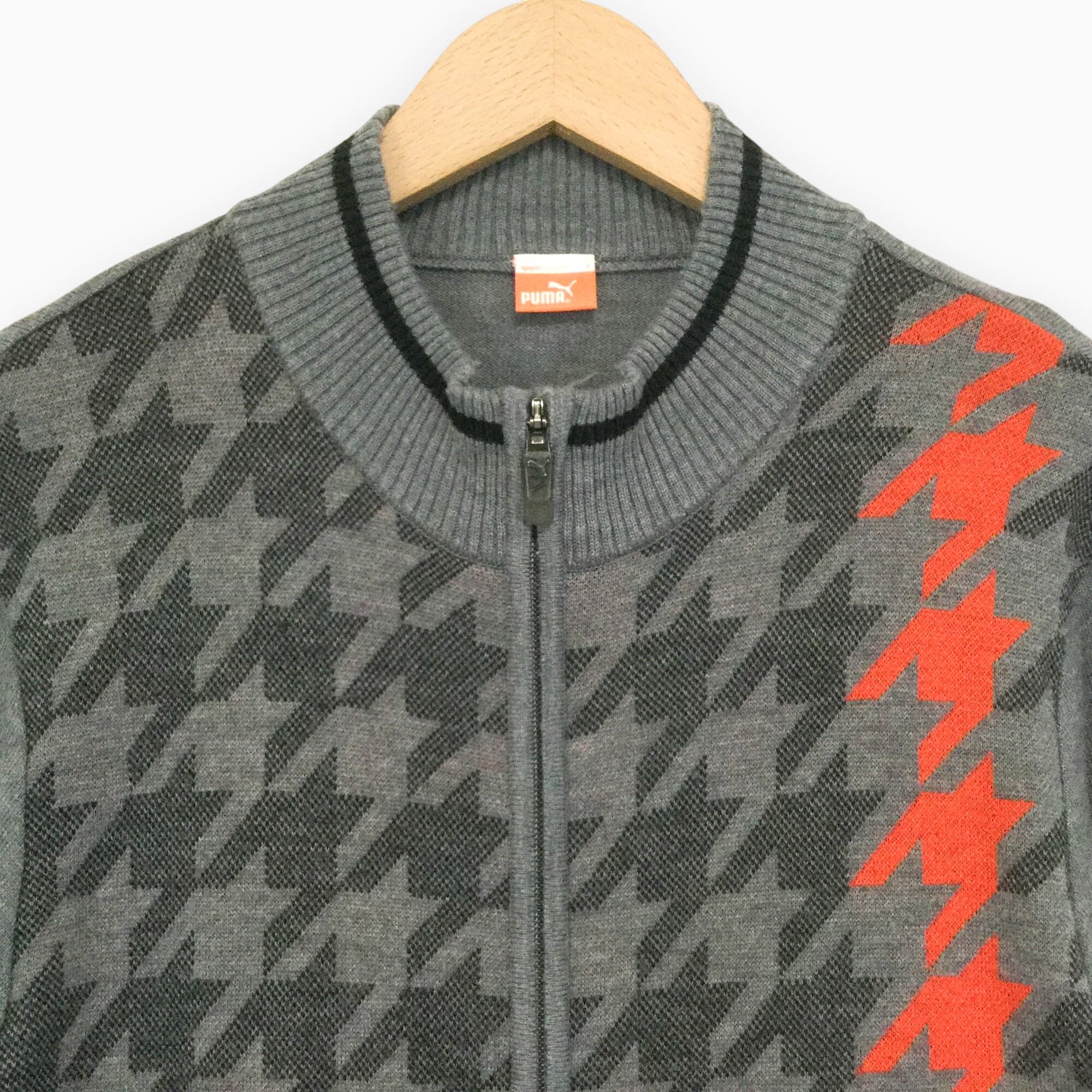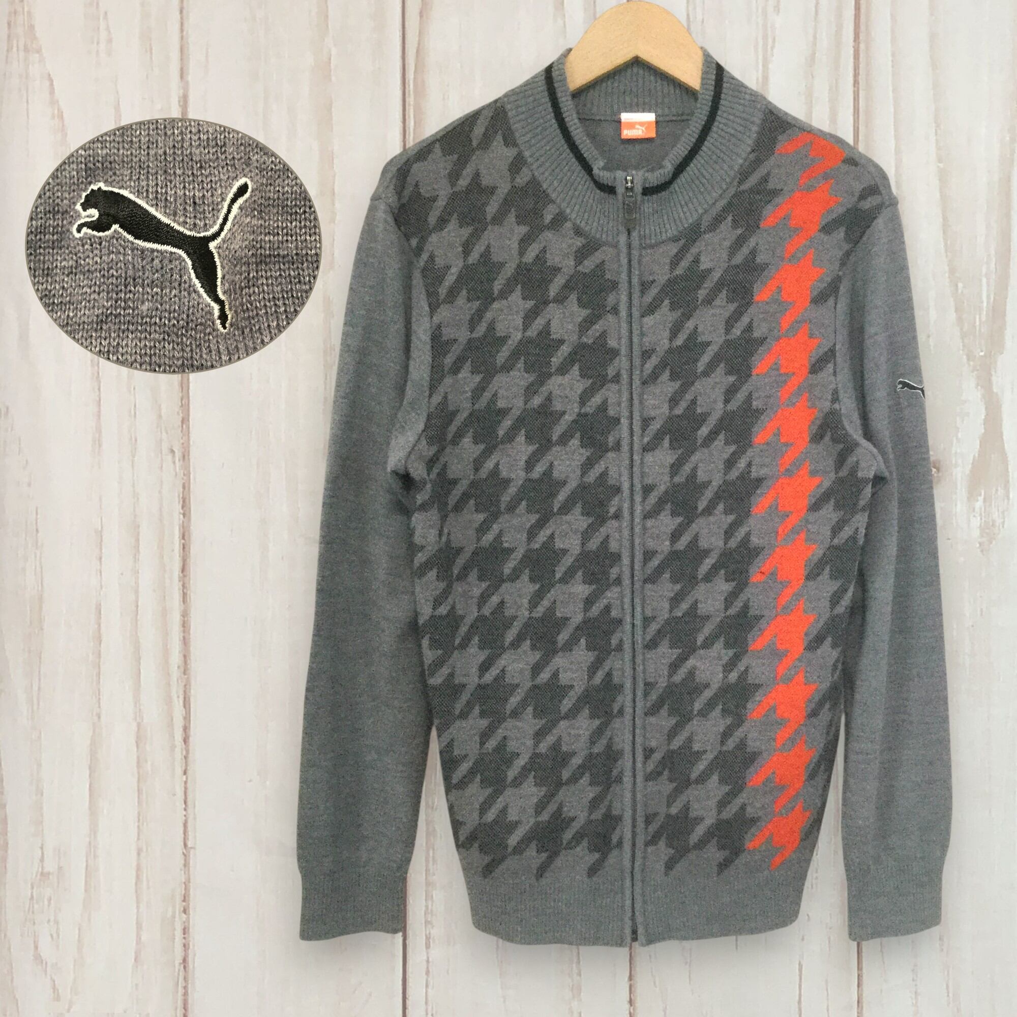 プーマ PUMA グレー 総柄 袖ロゴ ニットカーディガン ジップアップ 日本製 ウール混 アクリル混 長袖 メンズ Lサイズ レイヤード 秋冬 ヴィンテージ風 古着 ニット