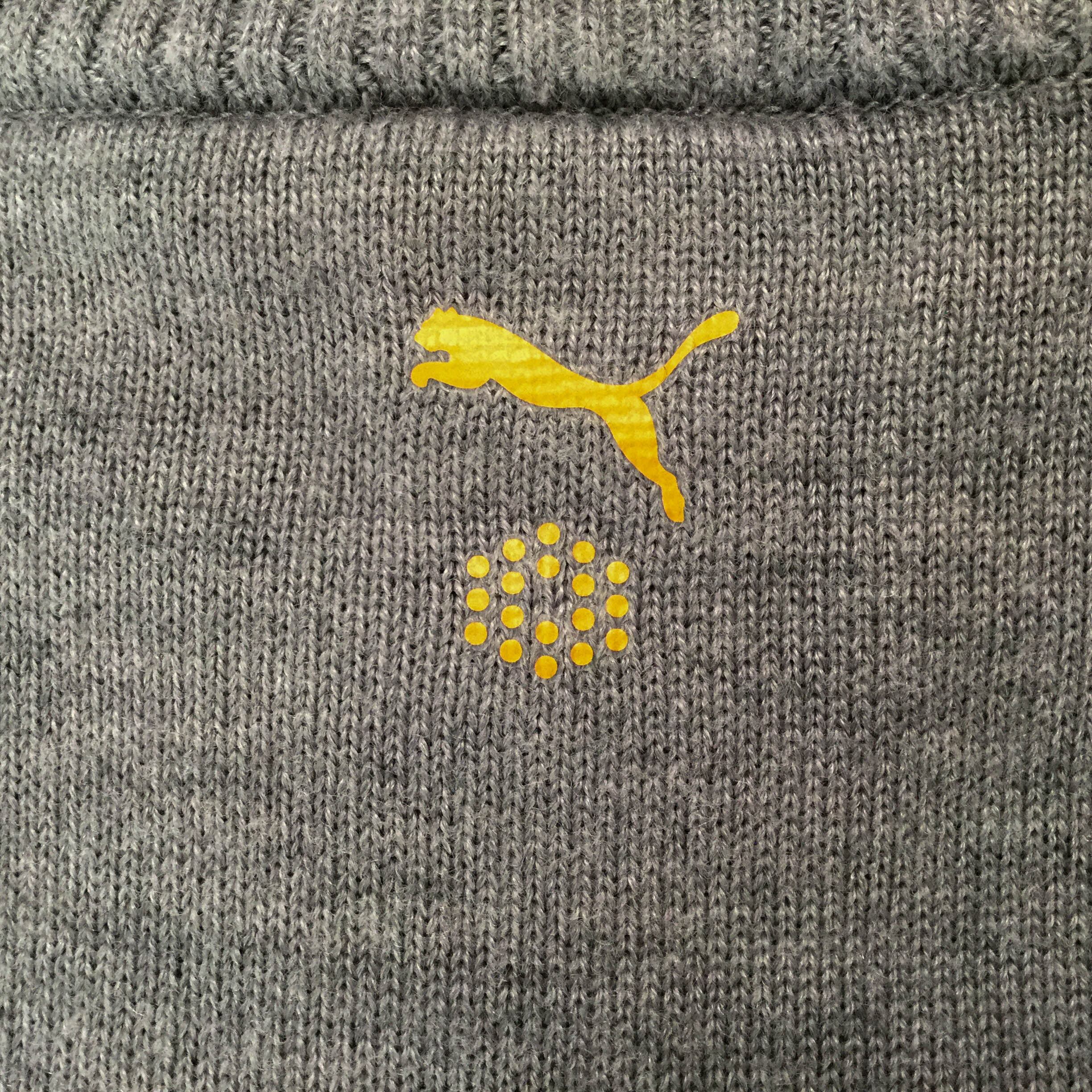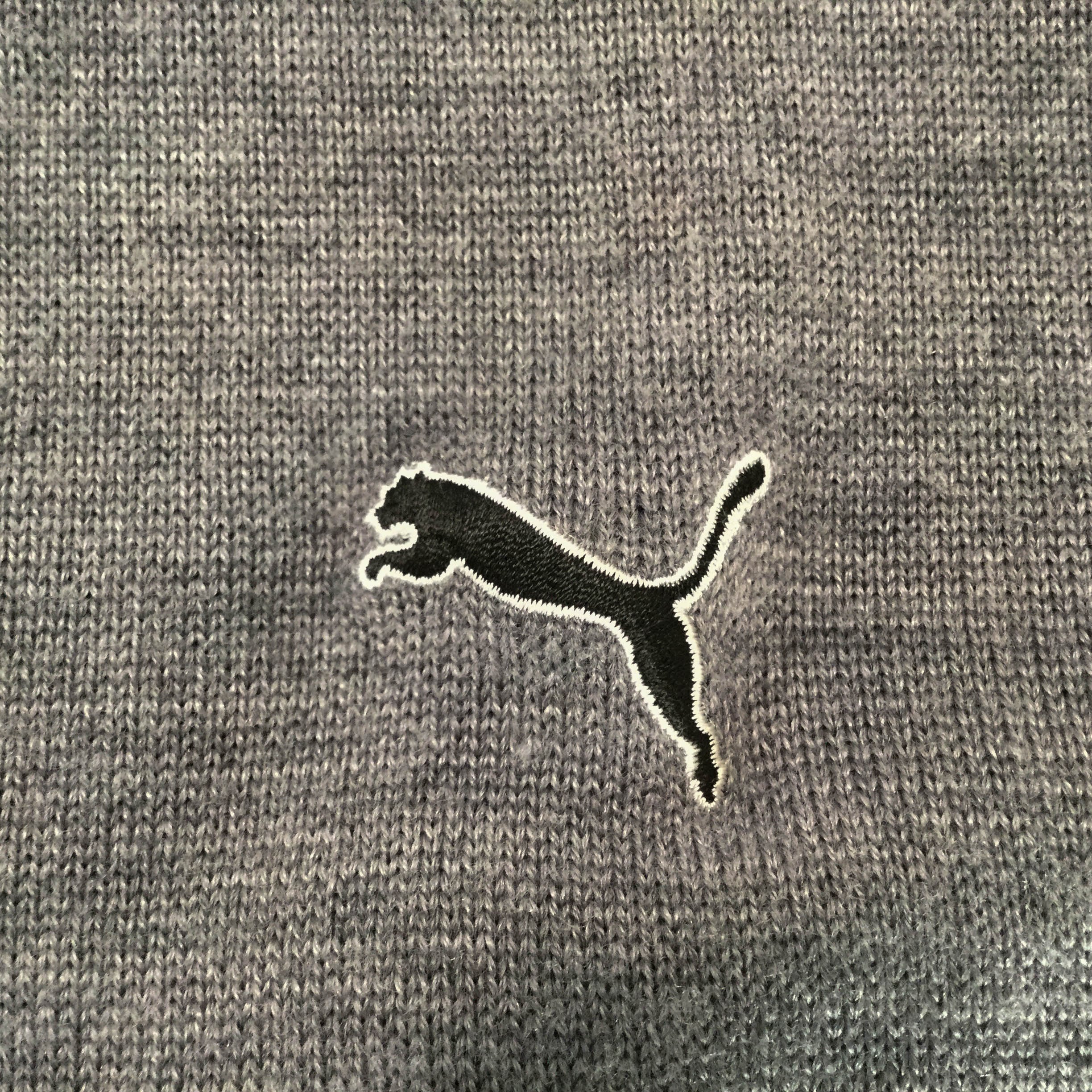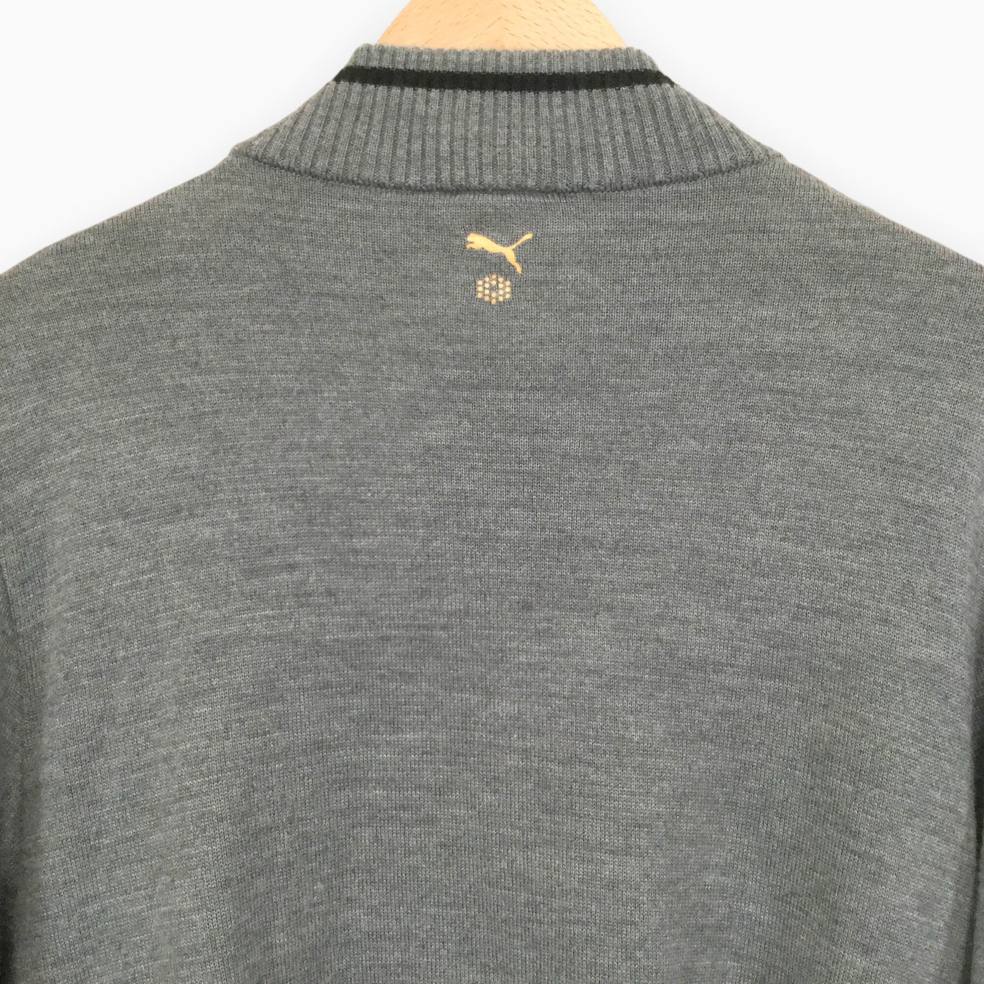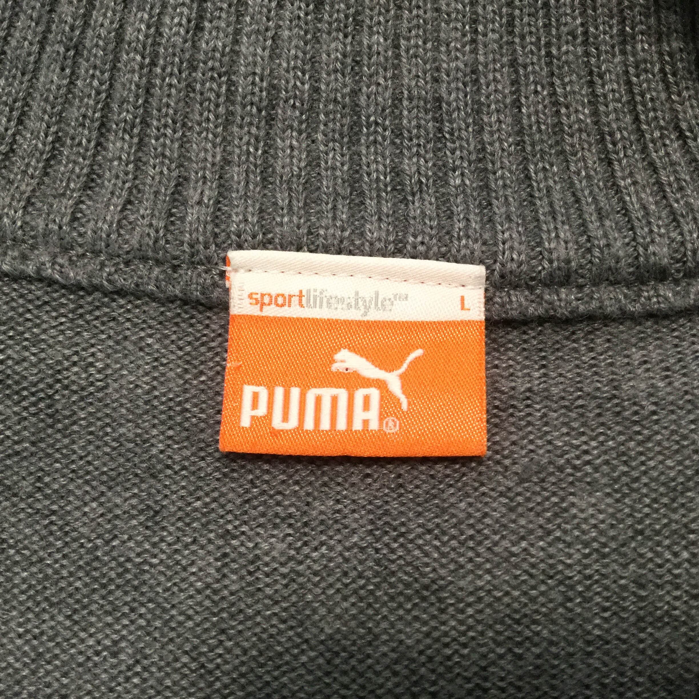 プーマ PUMA グレー 総柄 袖ロゴ ニットカーディガン ジップアップ 日本製 ウール混 アクリル混 長袖 メンズ Lサイズ レイヤード 秋冬 ヴィンテージ風 古着 ニット