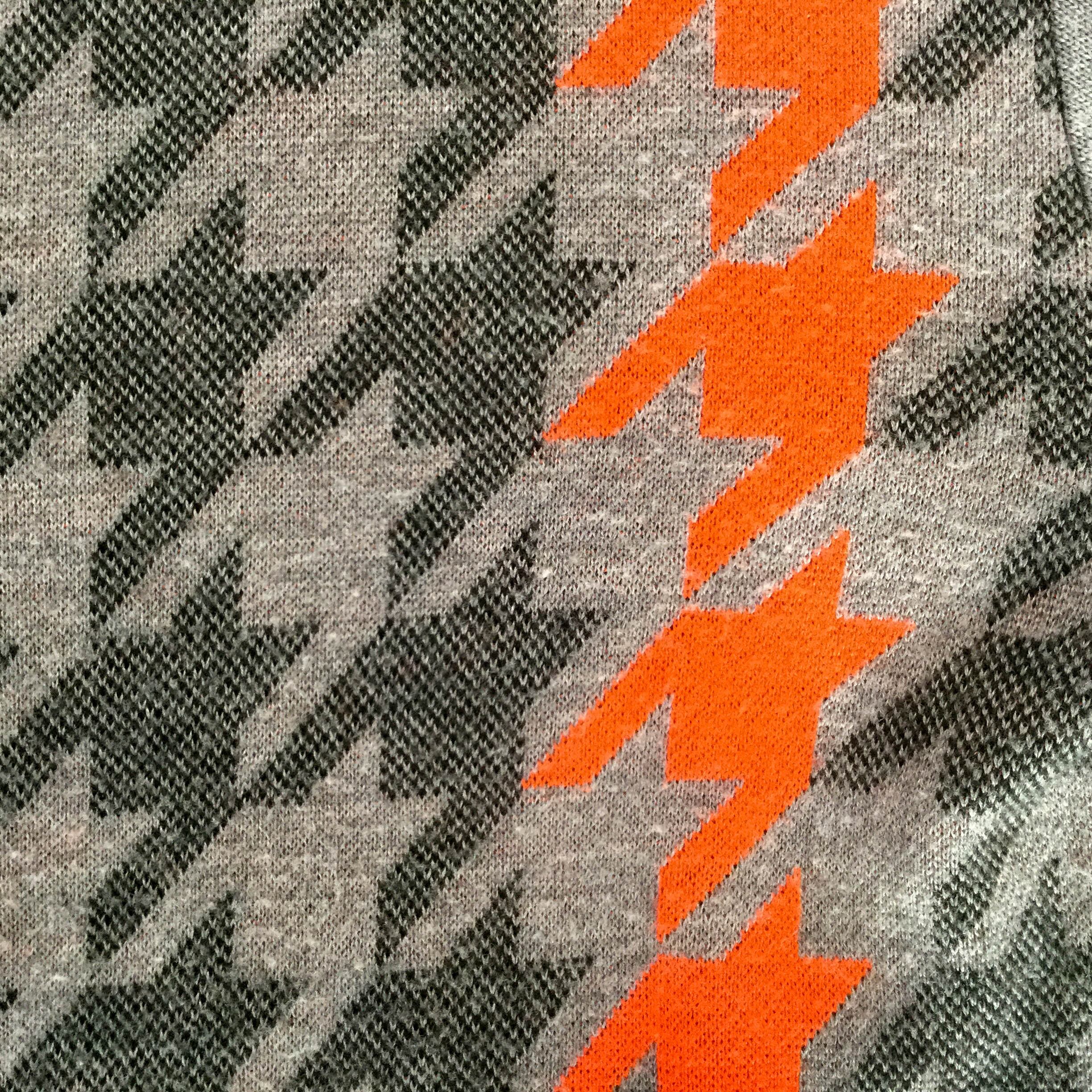 グレーを基調とした総柄デザインが目を引く、ジップアップ仕様のニットカーディガンです。