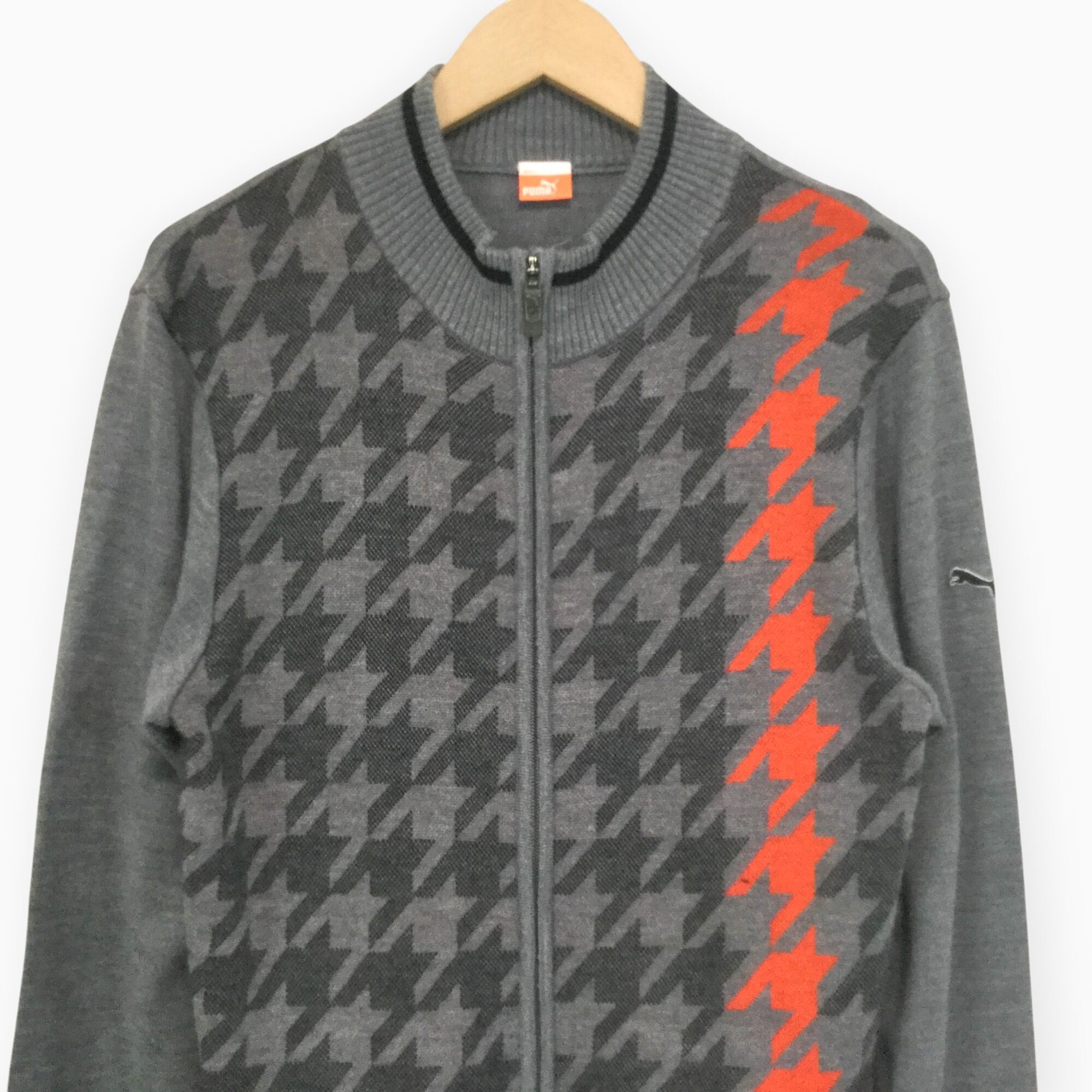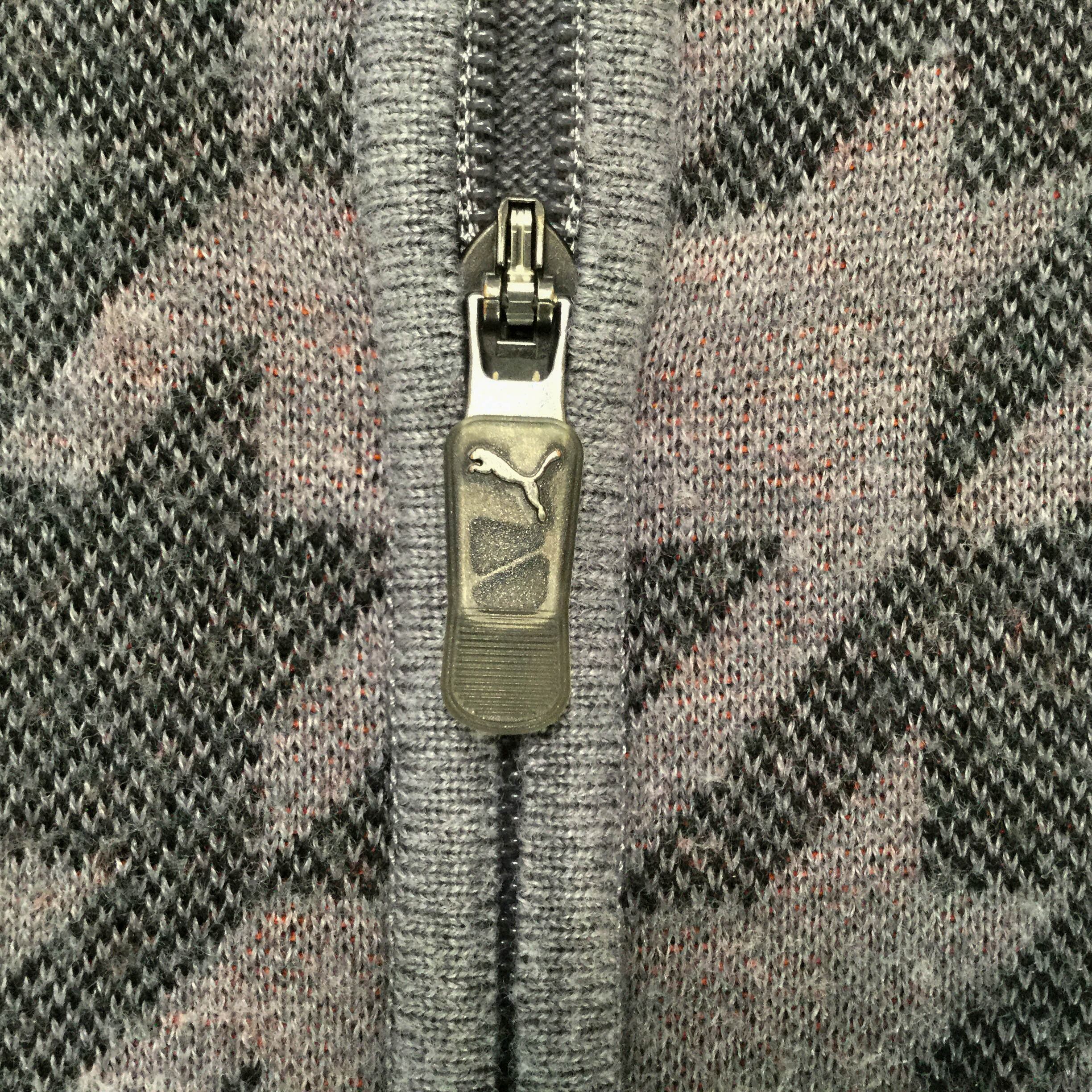 古着 プーマ PUMA 総柄 長袖ジップアップニットカーディガン 日本製 ニットカーディガン ジップアップ ウール混 L グレー