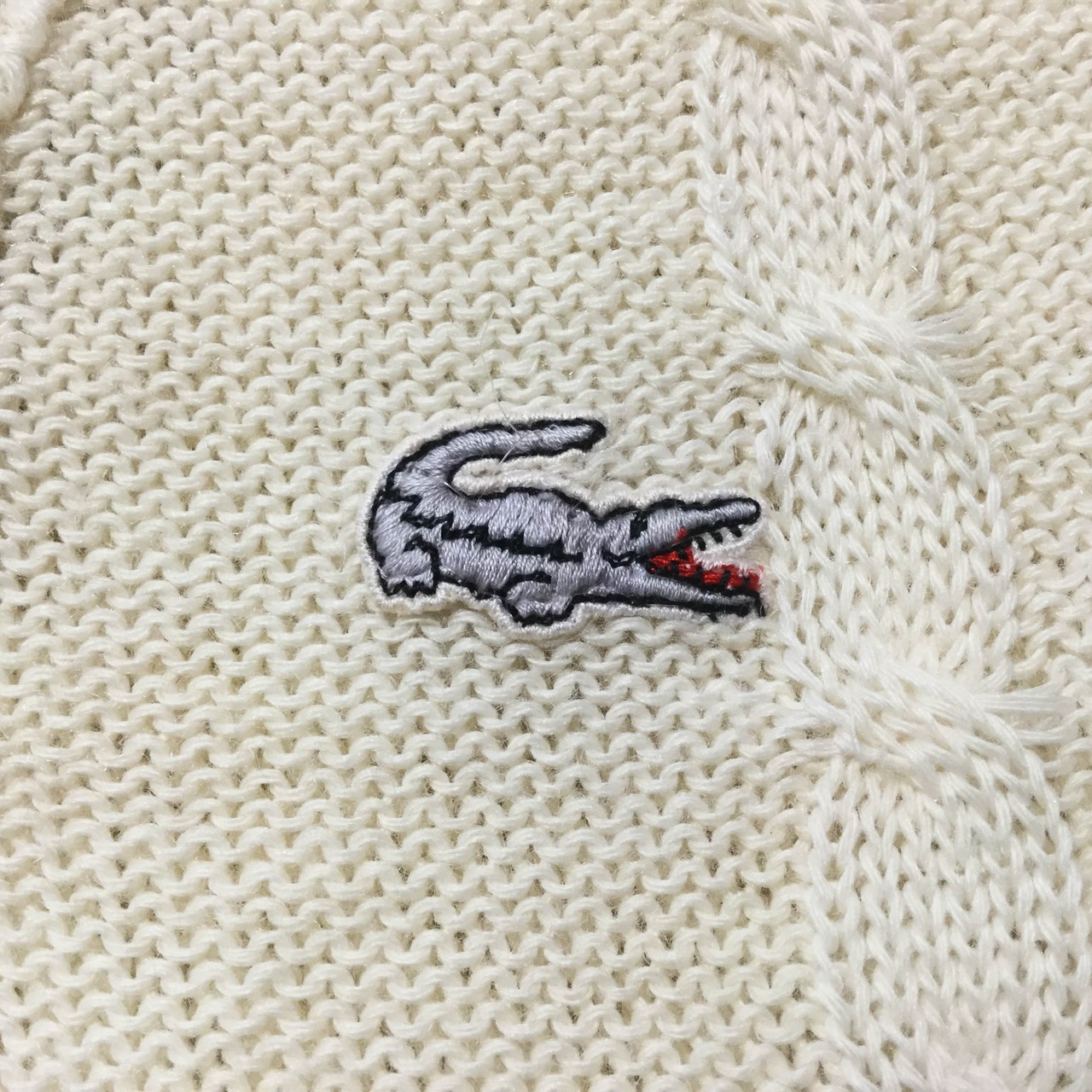 アイボリーのVネックにワニロゴ刺繍が映える、フランス製ラコステのヴィンテージニットベストです。