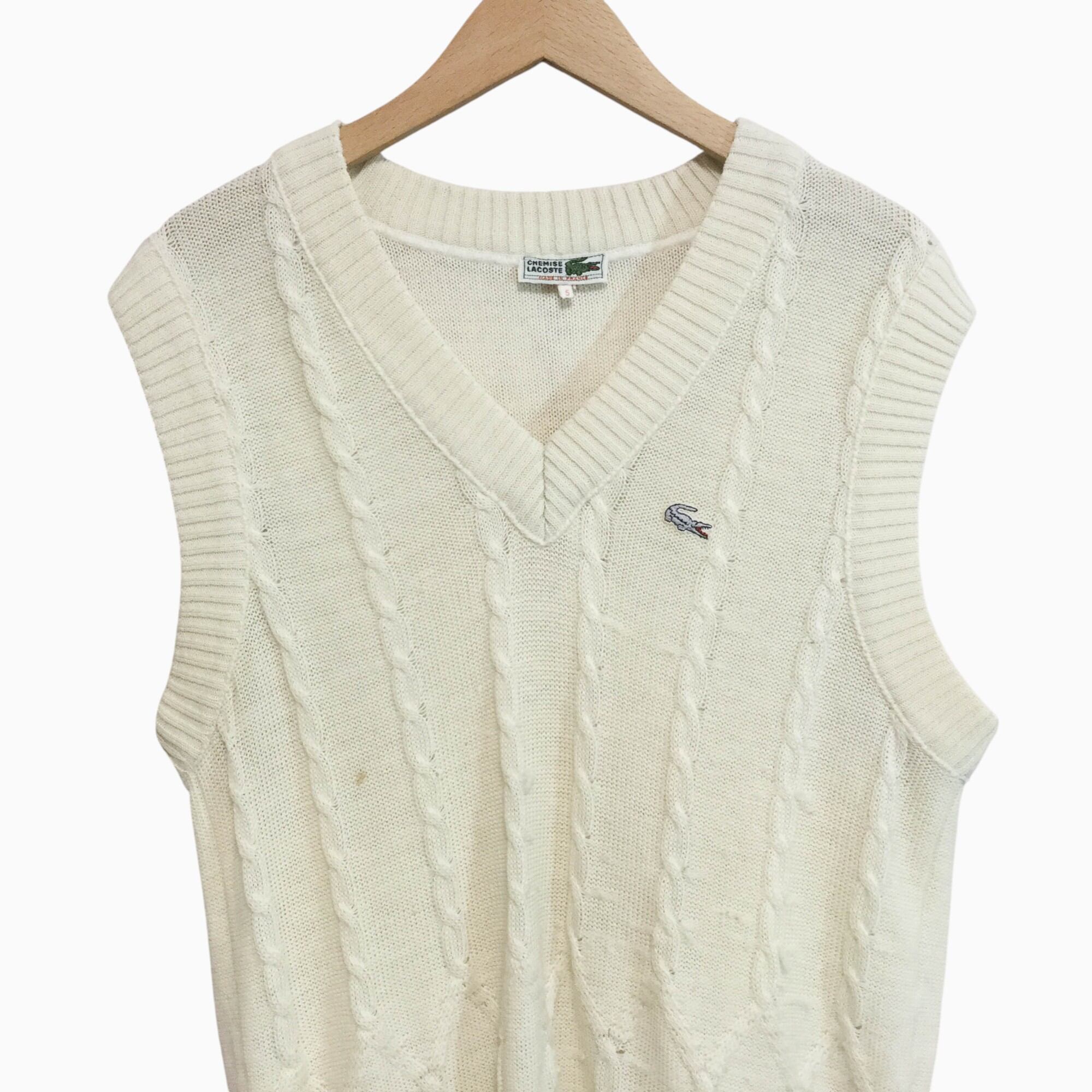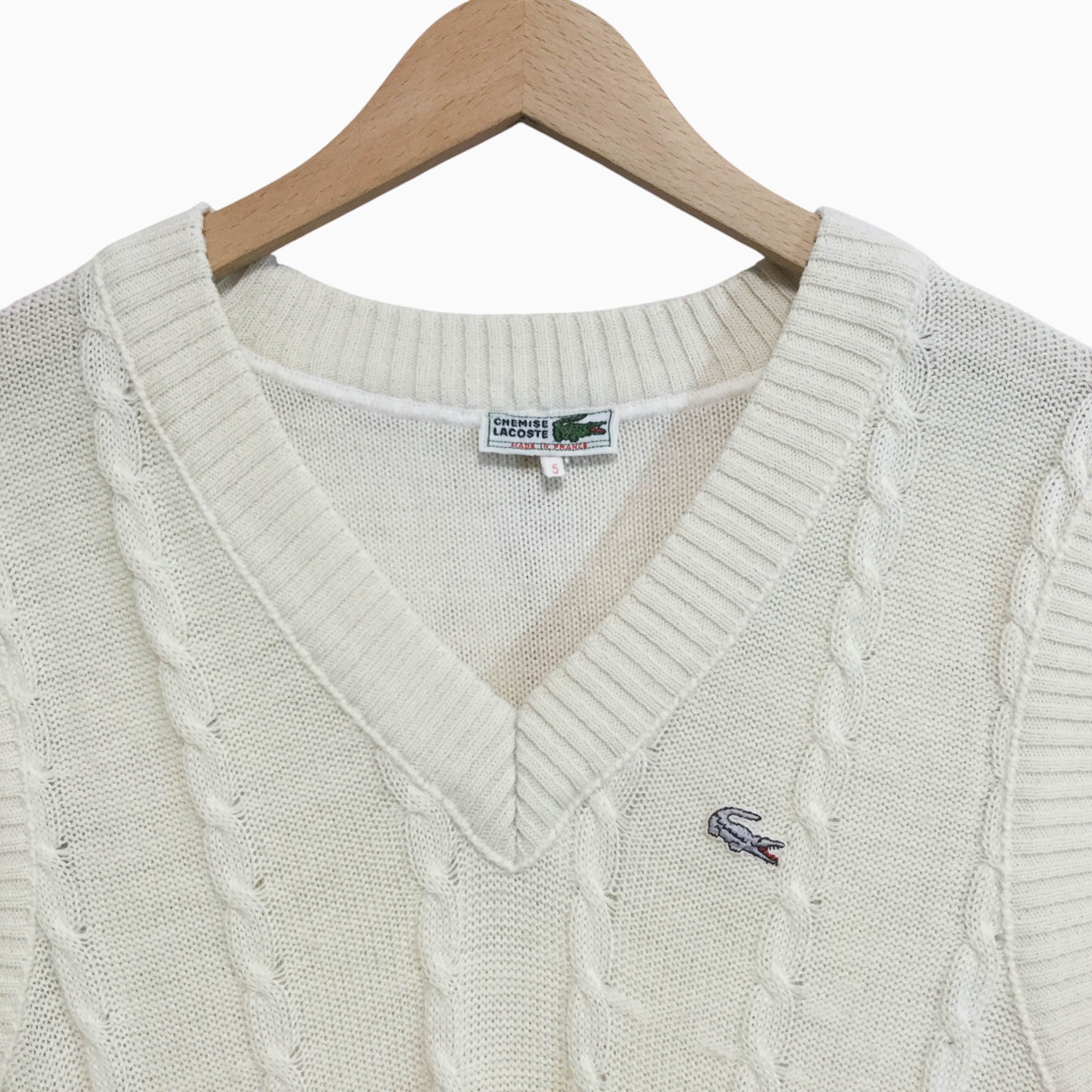 ラコステ LACOSTE アイボリー CHEMISE フランス製 ヴィンテージ フレラコ Vネック ニットベスト ワニロゴ 刺繍 ウール混 アクリル混 5号 レイヤード 70s 80s 90s フララコ