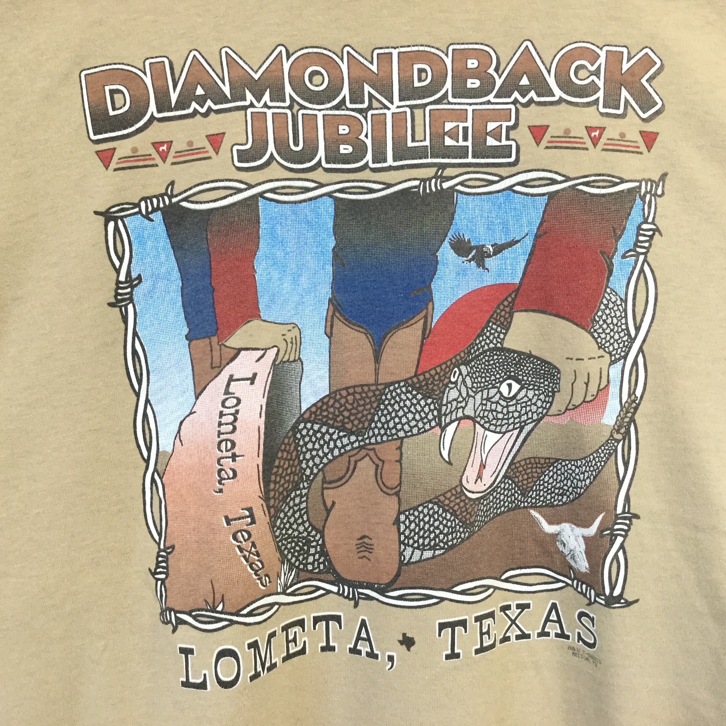 テキサス州ロメタの「ダイヤモンドバック・ジュビリー」記念デザインが目を引く、存在感のあるプリントTシャツです。