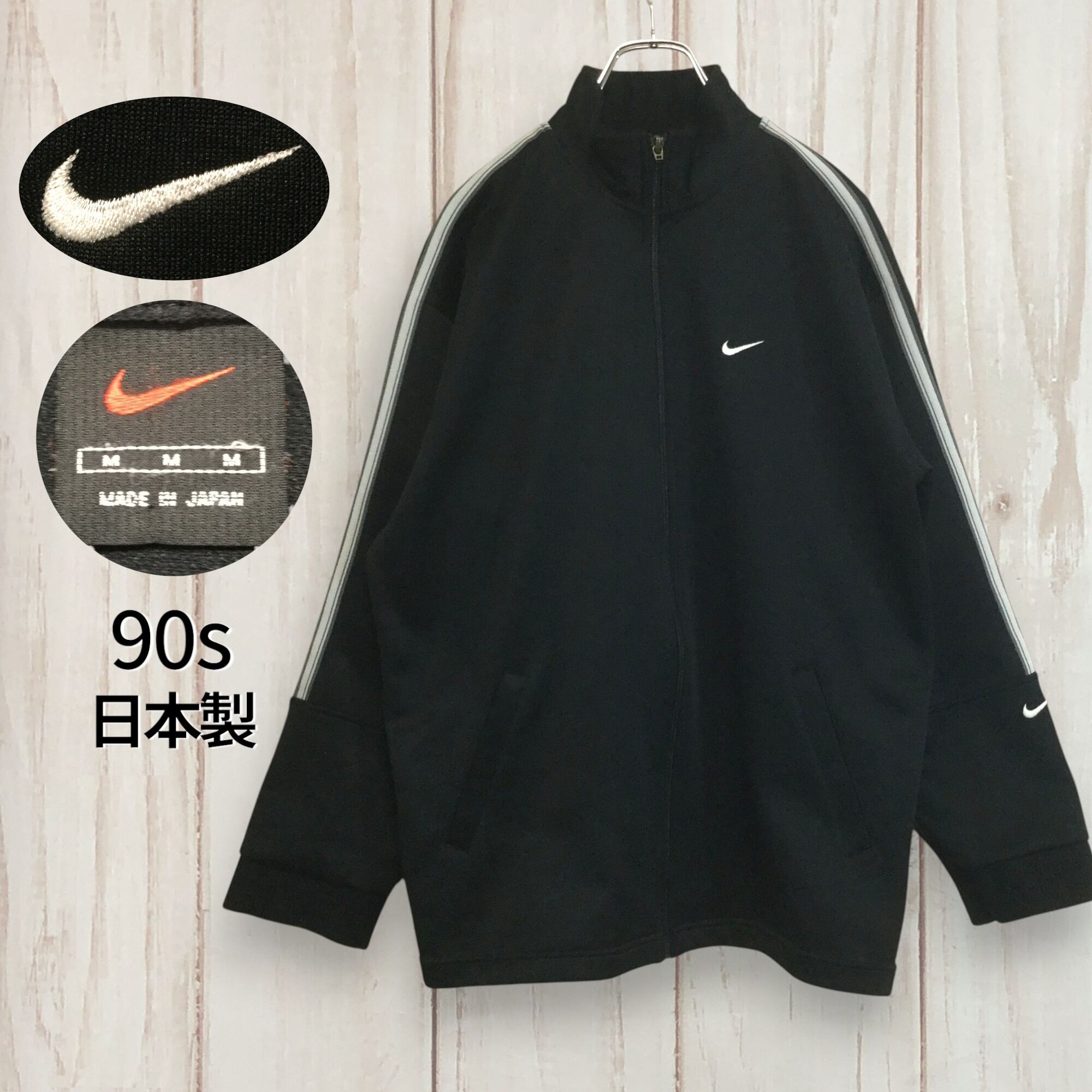 【ナイキ ジャージ】90s ロゴ刺繍 袖ロゴ サイドライン トラックジャケット M 黒 NIKE 古着 [250119-007]
