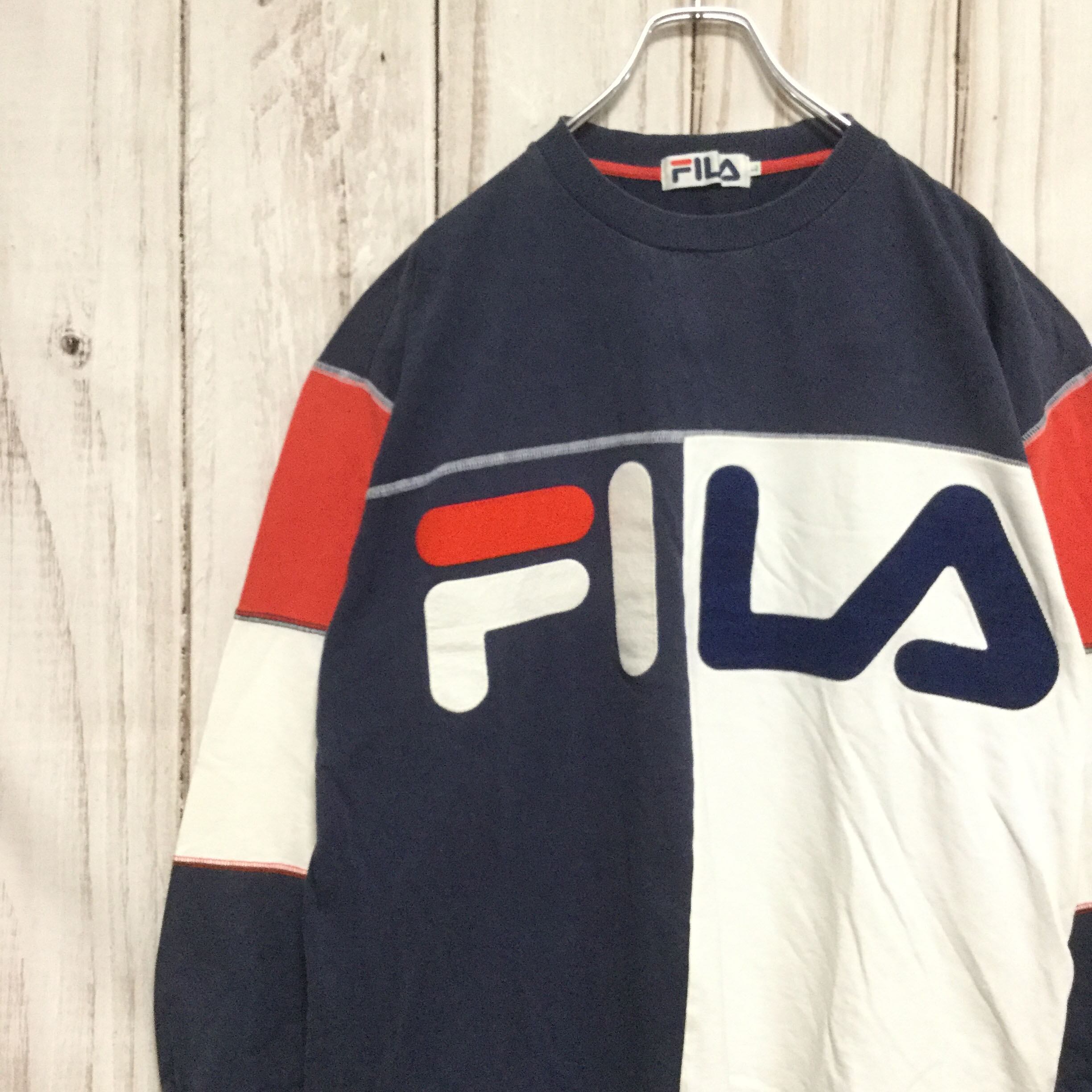 【フィラ ビッグロゴ 長袖Tシャツ】 90年代 ゆるだぼ 2XL相当 トリコカラー FILA 古着 [240111-003]