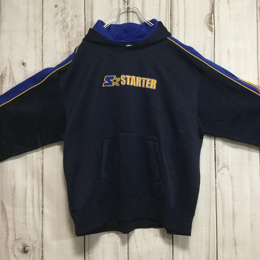 【スターター ビッグロゴパーカー】ファイヤーパターン スウェット プルオーパー XL ネイビー STARTER 長袖 古着 [240104-010]