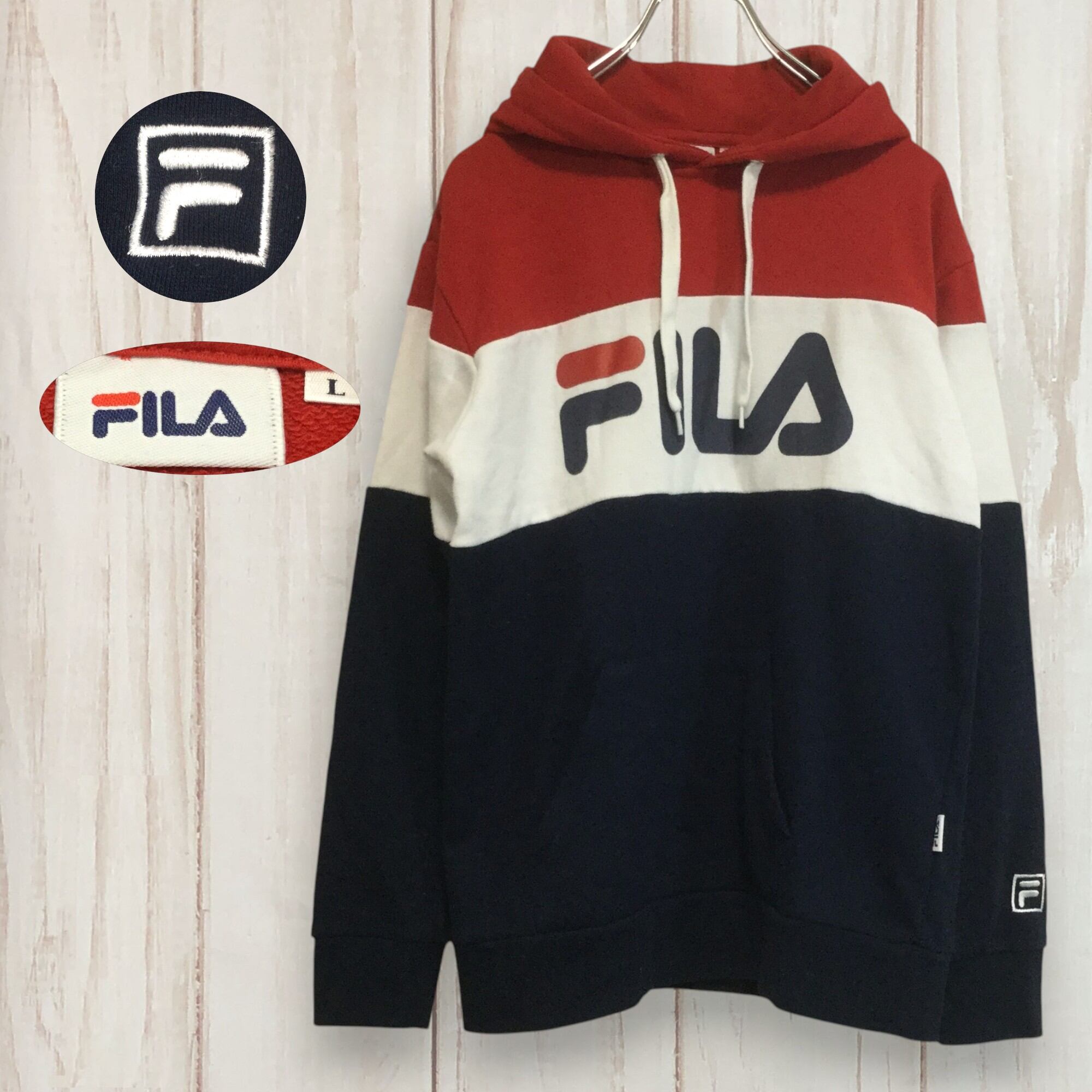 【フィラ 長袖ビッグロゴパーカー】プルオーバー L 赤白ネイビー FILA 古着 [250113-004]